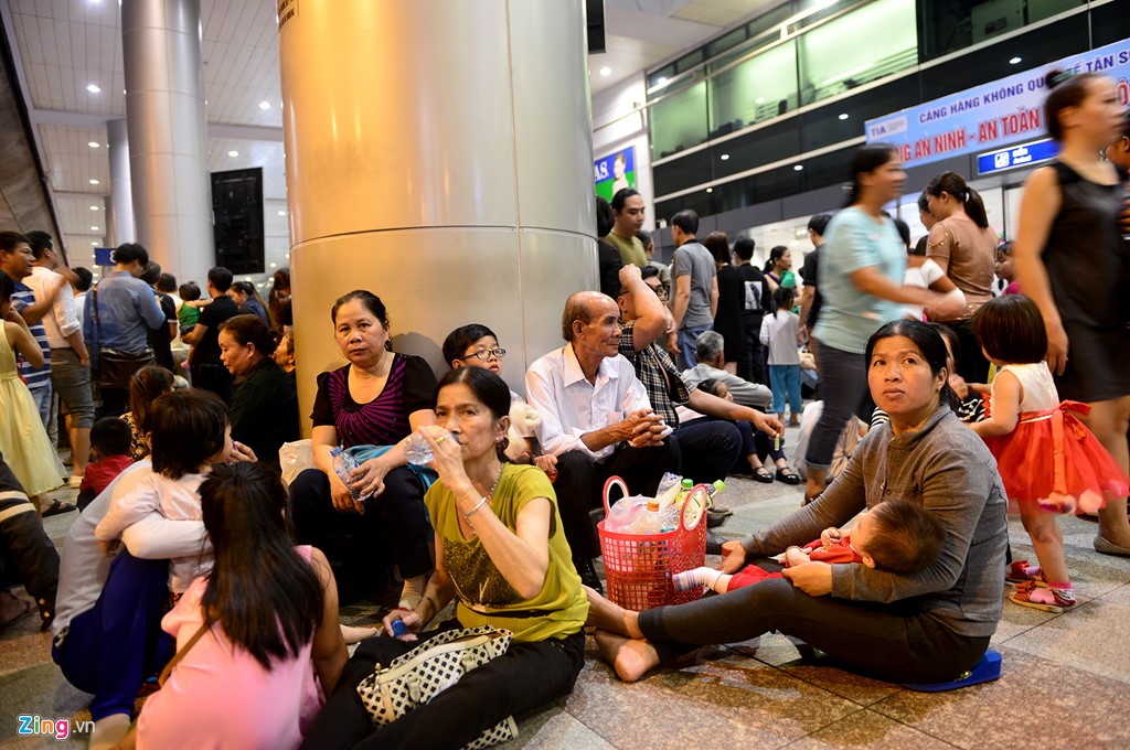 Nhiều gia đình mang theo đồ ăn, thức uống, trải ra nền nhà ga từ sớm. Chị Phan Thanh Tú (ngụ quận 6) cho biết sợ chuyến bay bị trễ đến giữa đêm nên cả nhà chuẩn bị ít đồ ăn, phòng khi đói bụng