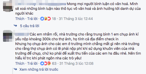 “Các em nhầm rồi, nhà trường cho rằng trung bình 1 em chụp ảnh kỉ yếu nộp khoảng 300k cho thợ ảnh, họ tính cả địa điểm check in. Nhưng họ chụp ảnh cho các em ở trường mình chẳng mất gì nên nhà trường cho rằng thợ chụp ảnh có lẽ phải nộp phí khi sử dụng khuôn viên của nhà trường để chụp, chứ ko phải đề xuất thu tiền của các em học sinh đâu nhé. Nên tìm hiểu kĩ trc khi phát ngôn nha các trò yêu!”