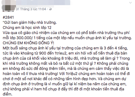 Theo bài viết, một trong số các lớp cuối cấp chụp kỷ yếu trong trường đã được thông báo về mức phí thu nếu chụp kỷ yếu tại trường. 300 nghìn đồng một lớp trong một giờ đồng hồ chụp ảnh tại trường. Nhận thấy đây là một việc vô lý, một học sinh giấu tên đã lên tiếng.