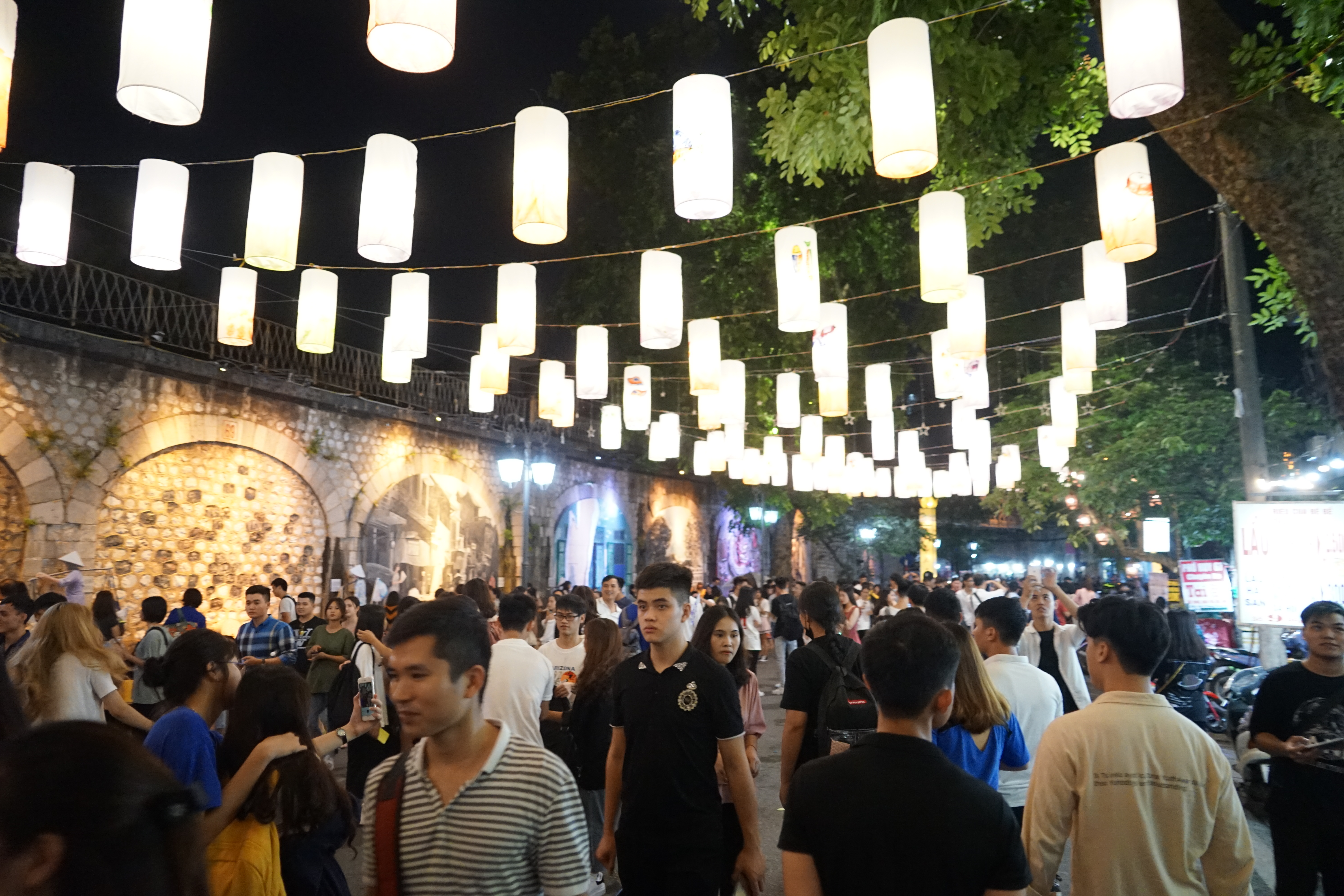 Năm nay, phố Phùng Hưng cũng thu hút đông đảo người tham quan bởi dàn đèn lồng sáng rực rỡ