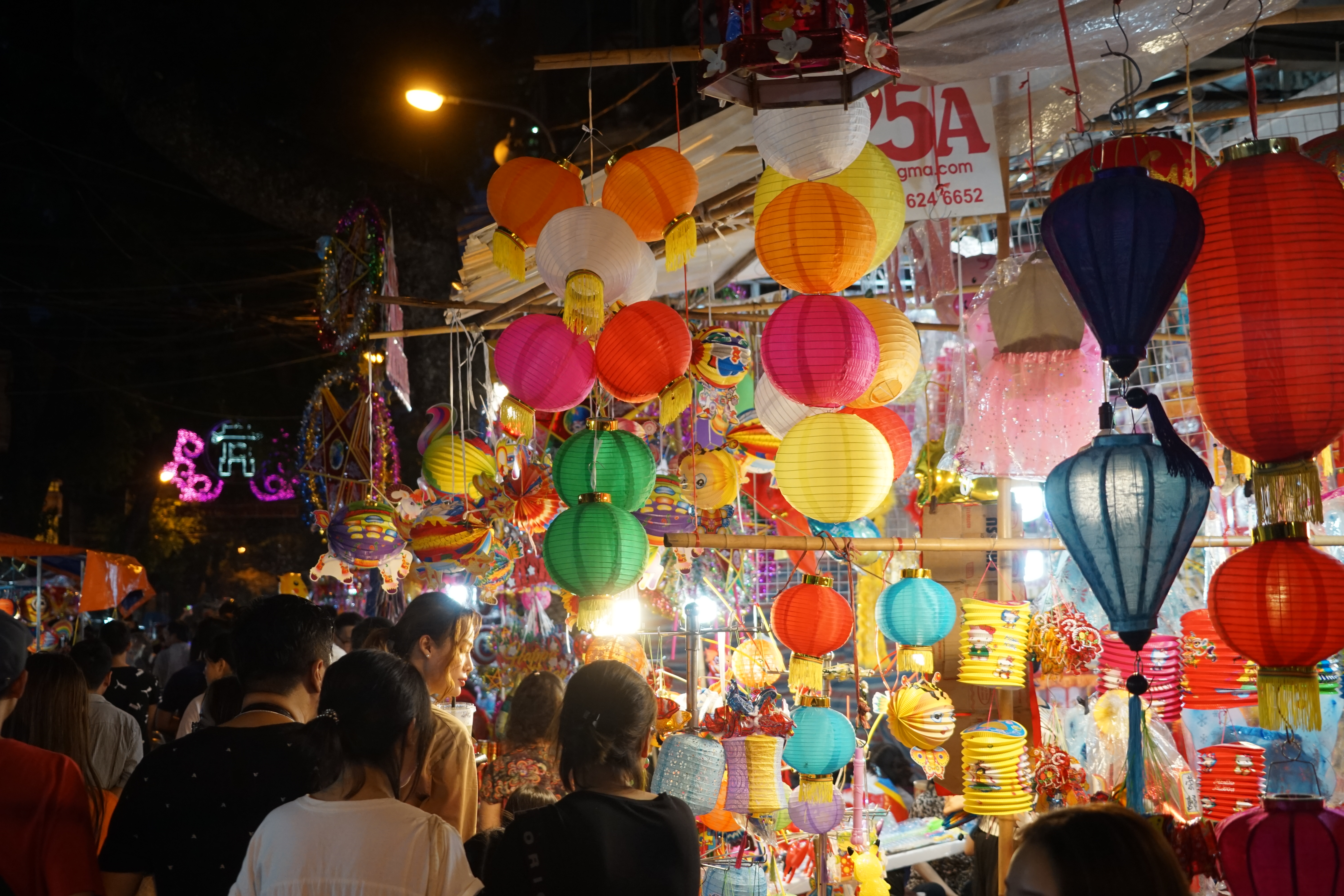 Những gian hàng treo đèn lồng đầy màu sắc thu hút sự chú ý của đông đảo người qua lại.