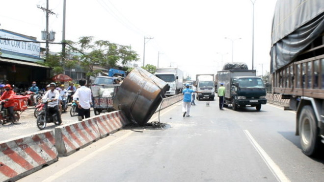 Sau khi rơi xuống đường, những lá inox sắc lẹm bị bung ra gây nguy hiểm cho người đi đường. Rất may các phương tiện giao thông đã kịp thời né tránh nên không có tai nạn xảy ra.