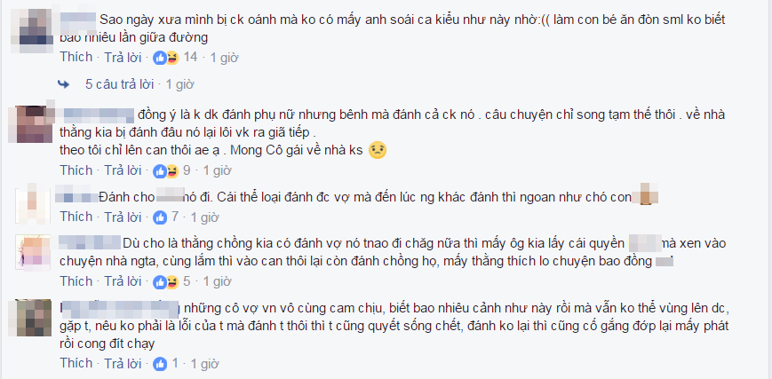 “Dù cho là thằng chồng kia có đánh vợ nó như thế nào đi chăng nữa thì mấy ông kia lấy cái quyền gì mà xen vào chuyện nhà người ta, cùng lắm thì vào can thôi, lại còn đánh lại nữa” - tài khoản T.V bình luận.
