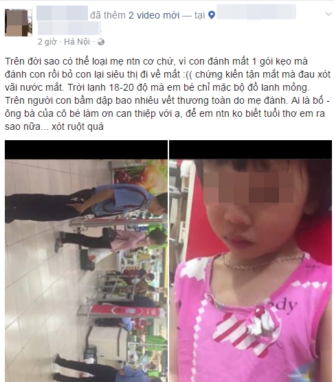 Vào ngày 18/2, một tài khoản facebook có tên là M.M đã chia sẻ hai đoạn clip ngắn với dòng trạng thái thu hút sự chú ý của cư dân mạng. Theo đó, chỉ vì làm mất một gói kẹo mà bé gái bị một người phụ nữ được cho là mẹ đánh đập dã man ngay tại siêu thị.