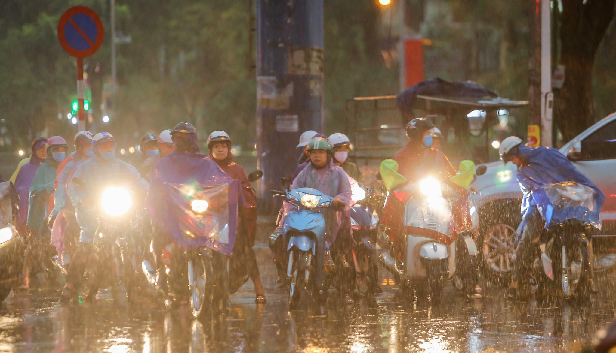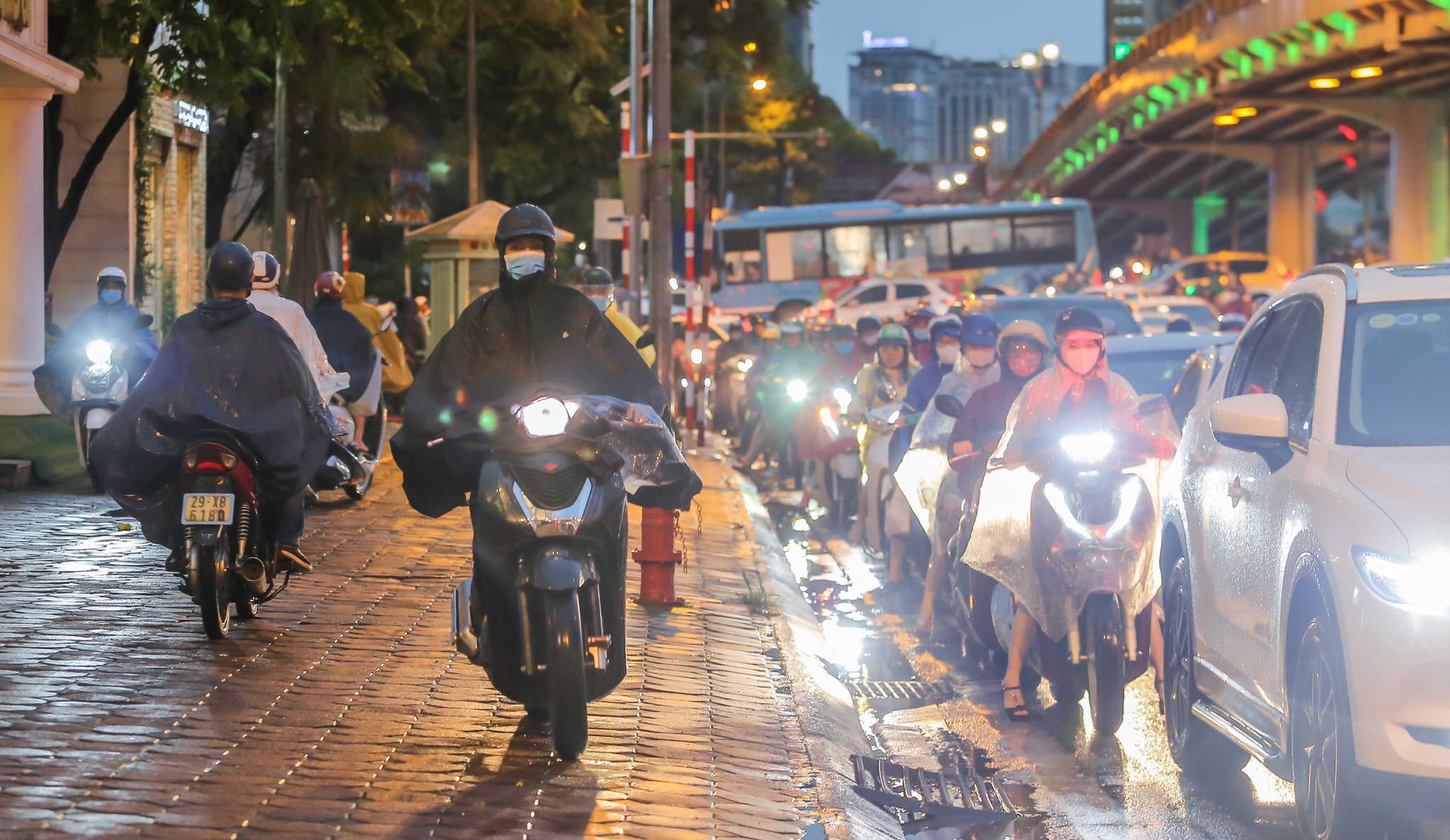 Tại một số tuyến phố trung tâm, lưu lượng phương tiện đông kèm theo gió rít mạnh rồi đổ mưa lớn khiến nhiều người trở tay không kịp. Nhiều phương tiện chôn chân trong mưa.