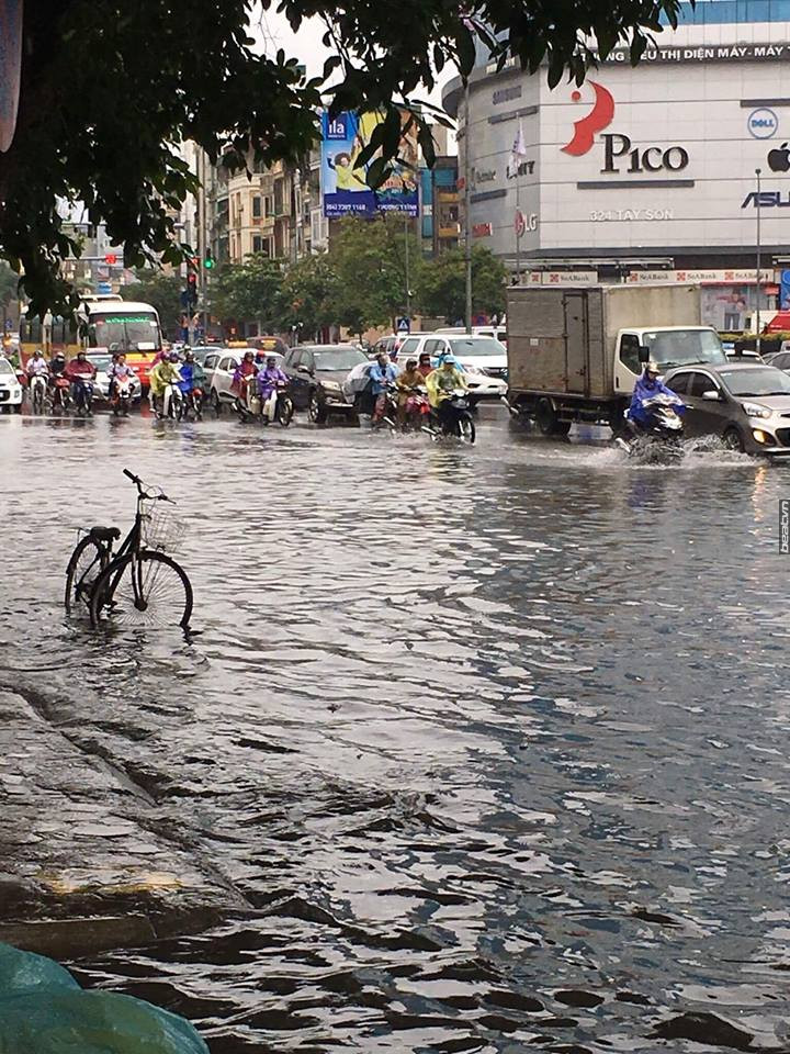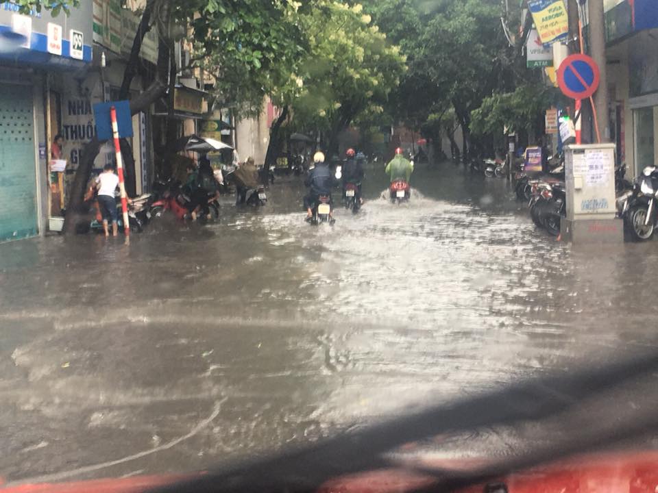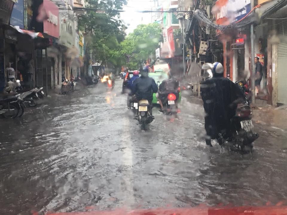 Khoảng 9h sáng ngày 12/5, một cơn mưa lớn kèm gió mạnh bất ngờ trút xuống nhiều khu vực tại Hà Nội khiến nhiều tuyến đường bị ngập nặng và bị ùn tắc.