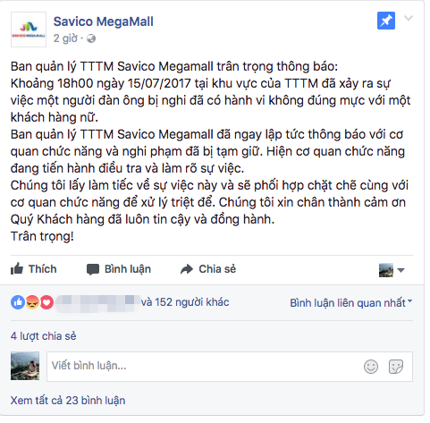 Tối cùng ngày, trên trang fanpage của Trung tâm thương mại này cũng đã xác nhận sự việc. Nội dung bài chia sẻ như sau: “Ban quản lý TTTM Savico Megamall trân trọng thông báo: Khoảng 18h00 ngày 15/07/2017 tại khu vực của TTTM đã xảy ra sự việc một người đàn ông bị nghi đã có hành vi không đúng mực với một khách hàng nữ.