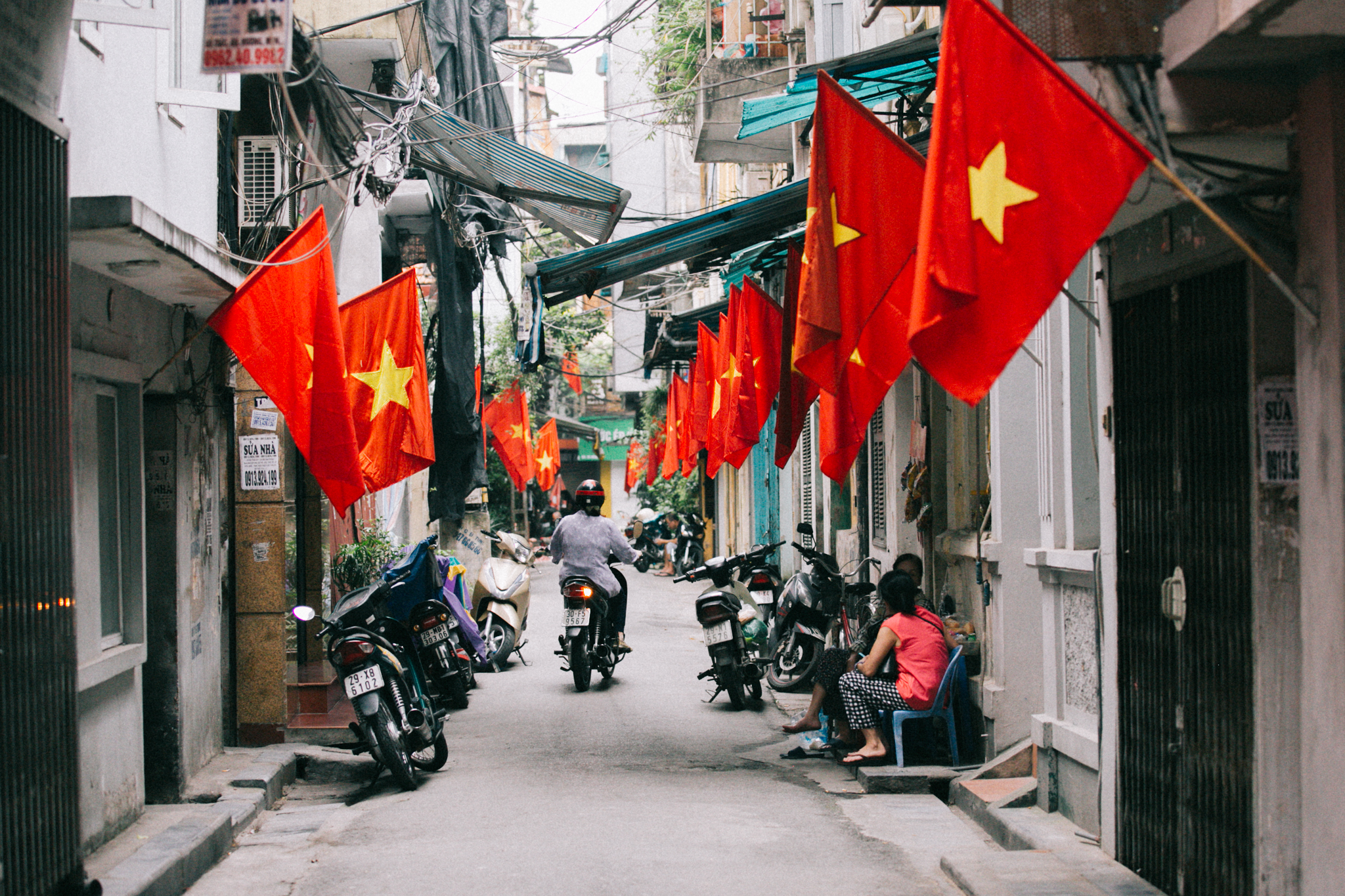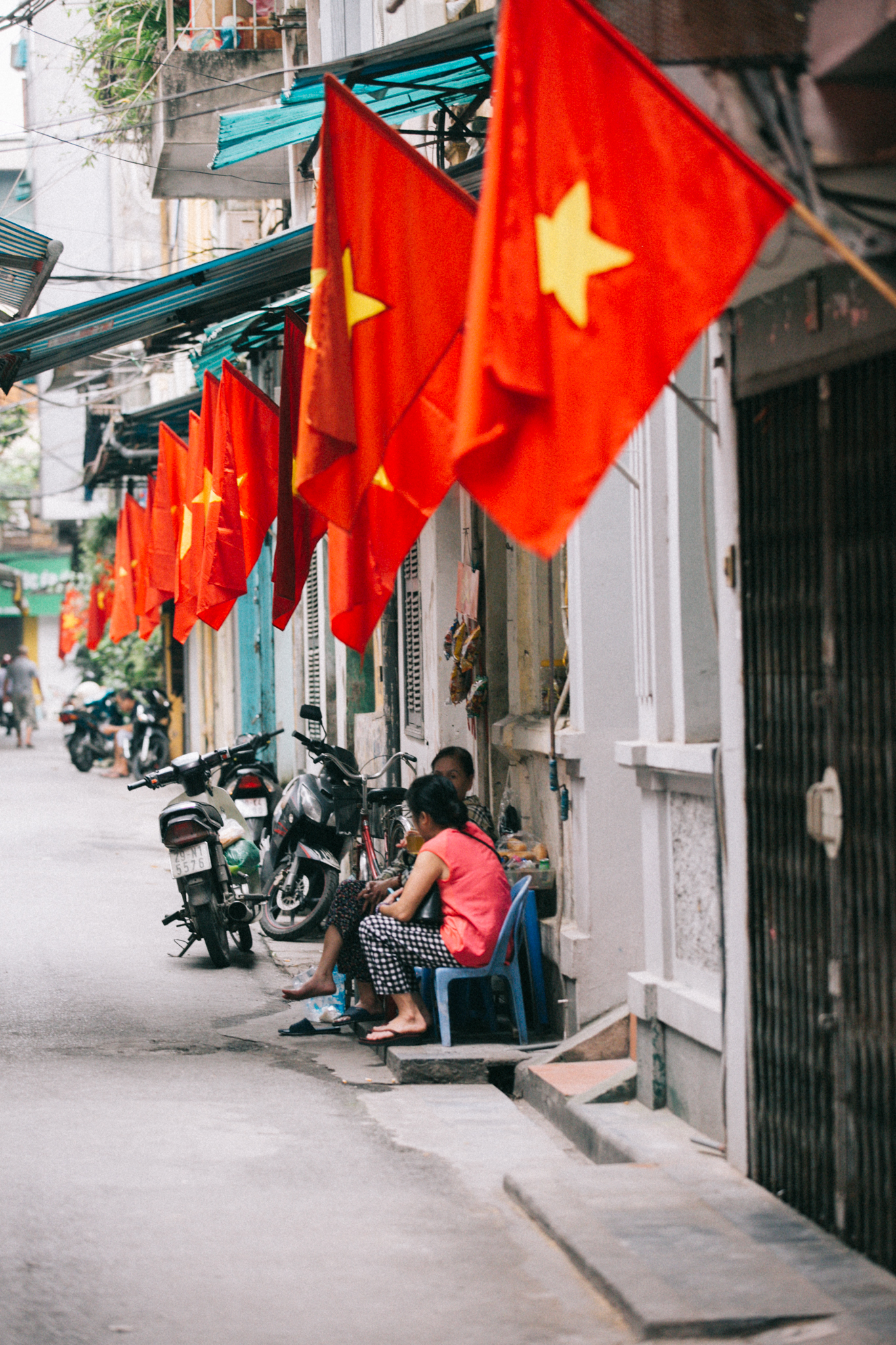 Màu đỏ rực rỡ cùng không khí ngày kỷ niệm bao trùm ngõ Kim Mã, Hà Nội.