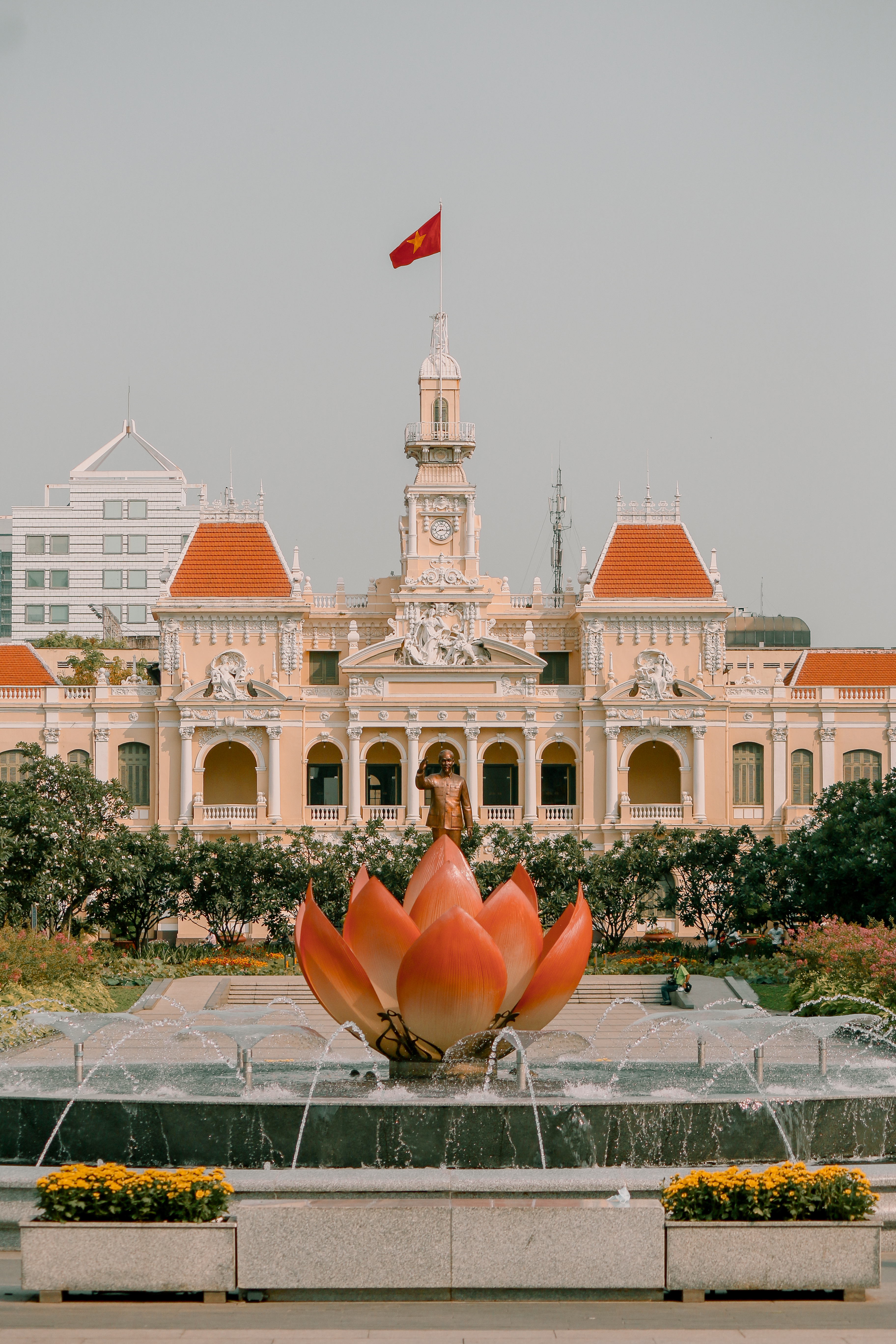 Tượng đài Hồ Chủ tịch tại quãng trường Nguyễn Huệ, phía sau là trụ sở của UBND TP HCM