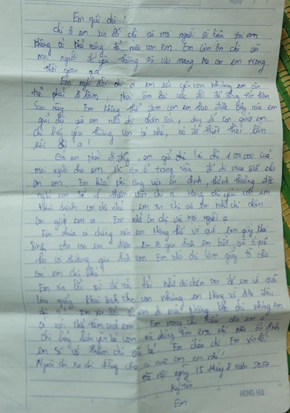 Em xin lỗi chị và mọi người vì hiện tại em không có khả năng để nuôi con em. Em cảm ơn chị và mọi người đã yêu thương và cưu mang mẹ con em trong thời gian qua. Em nghĩ rồi chị ạ, em rất yêu con nhưng em còn trẻ phải đi làm, phải làm lại cuộc đời để sống tốt hơn sau này. Em không thể đem con em theo được vậy nên em gửi chị và em nhờ chị chăm sóc, dạy dỗ giúp em.
