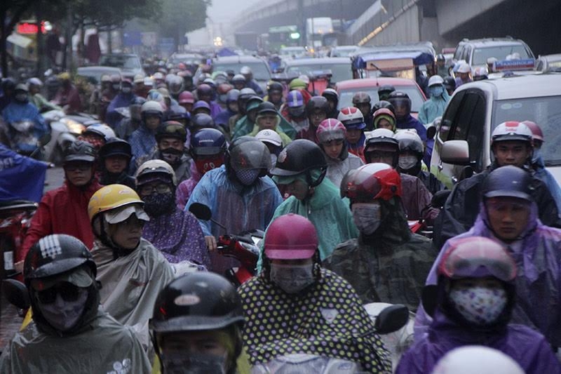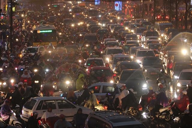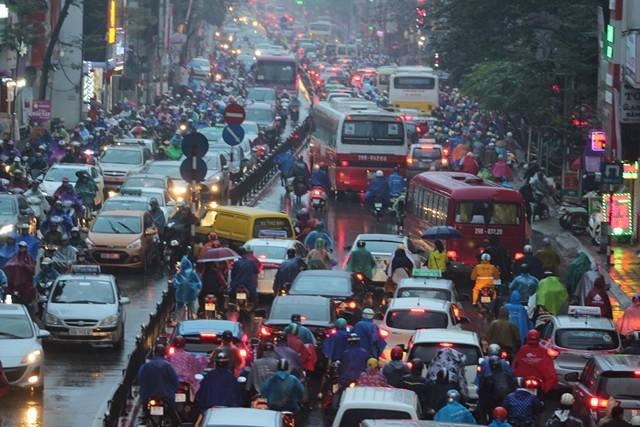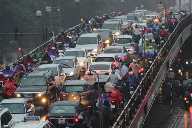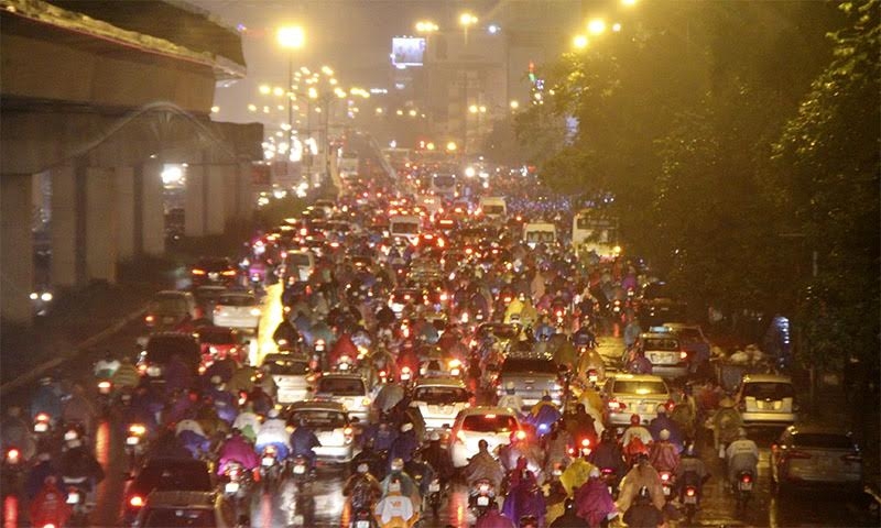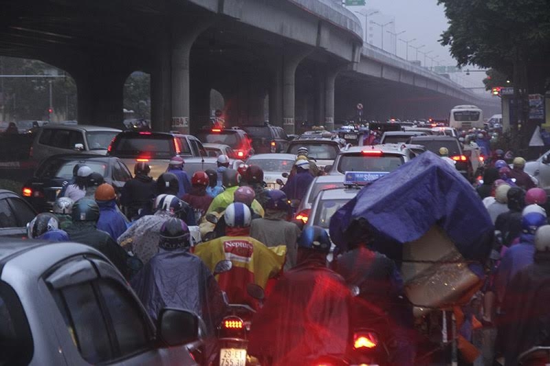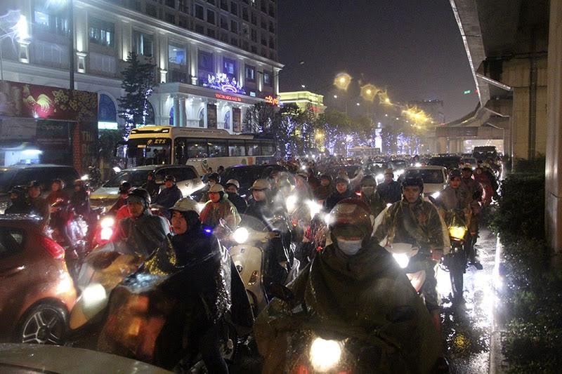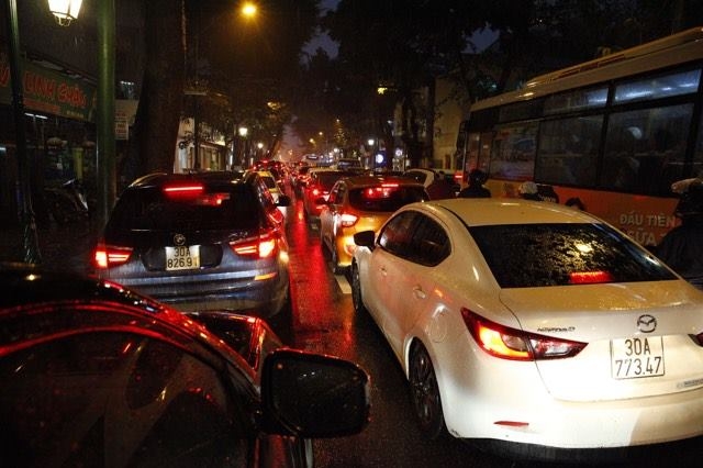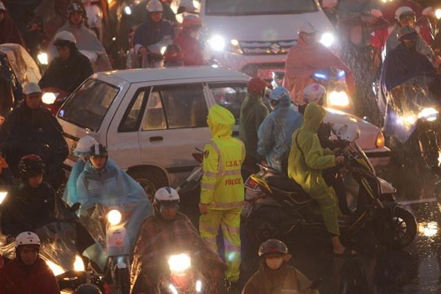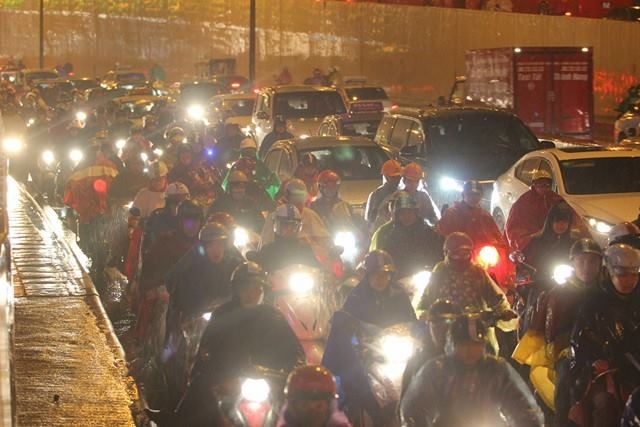 Đến 18h15, trời đã tối và tiếp tục mưa tầm tã, các ngả đường vẫn rất đông các phương tiện lưu thông. Khu vực hầm Kim Liên hướng Xã Đàn, các phương tiện di chuyển nhích từng mét rất vất vả.