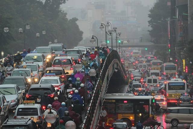 Cầu vượt Thái Hà ken cứng các phương tiện giao thông.
