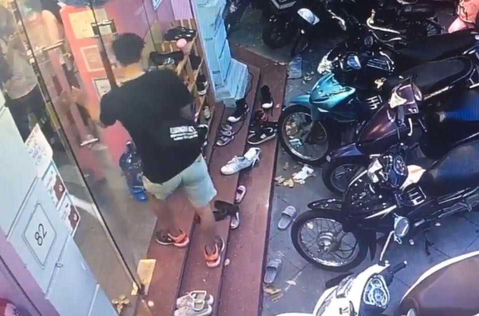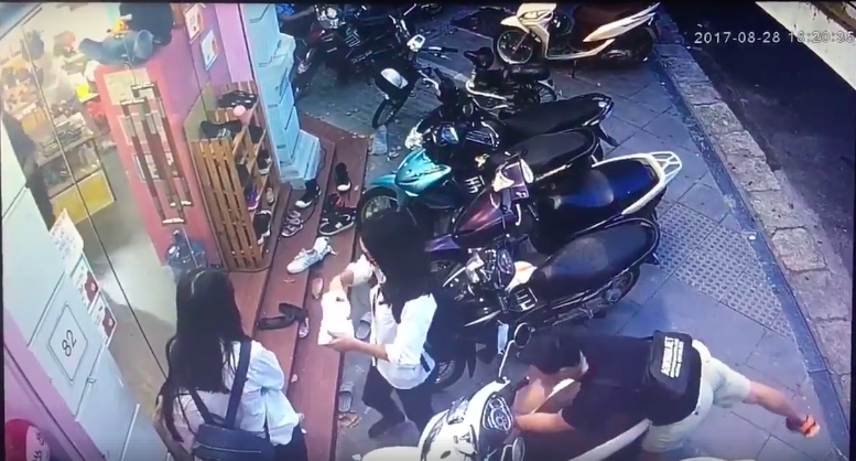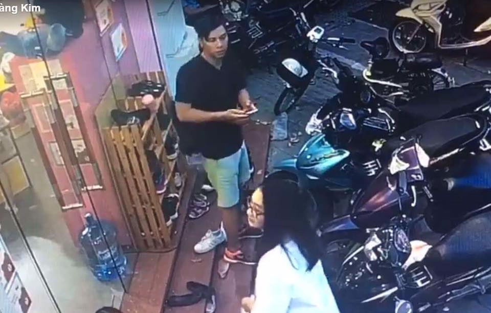 Đúng lúc đó, có 3 nữ sinh mặc đồng phục cũng đi ra khỏi cửa hàng và ngồi trên bậc thềm để xỏ giày. Nhân lúc có người đứng trước mặt che khuất tầm nhìn từ bên trong cửa hàng, anh ta nhanh chóng bẻ khóa và lấy trộm chiếc xe máy trước mặt 3 nữ sinh mà không một ai hay biết.