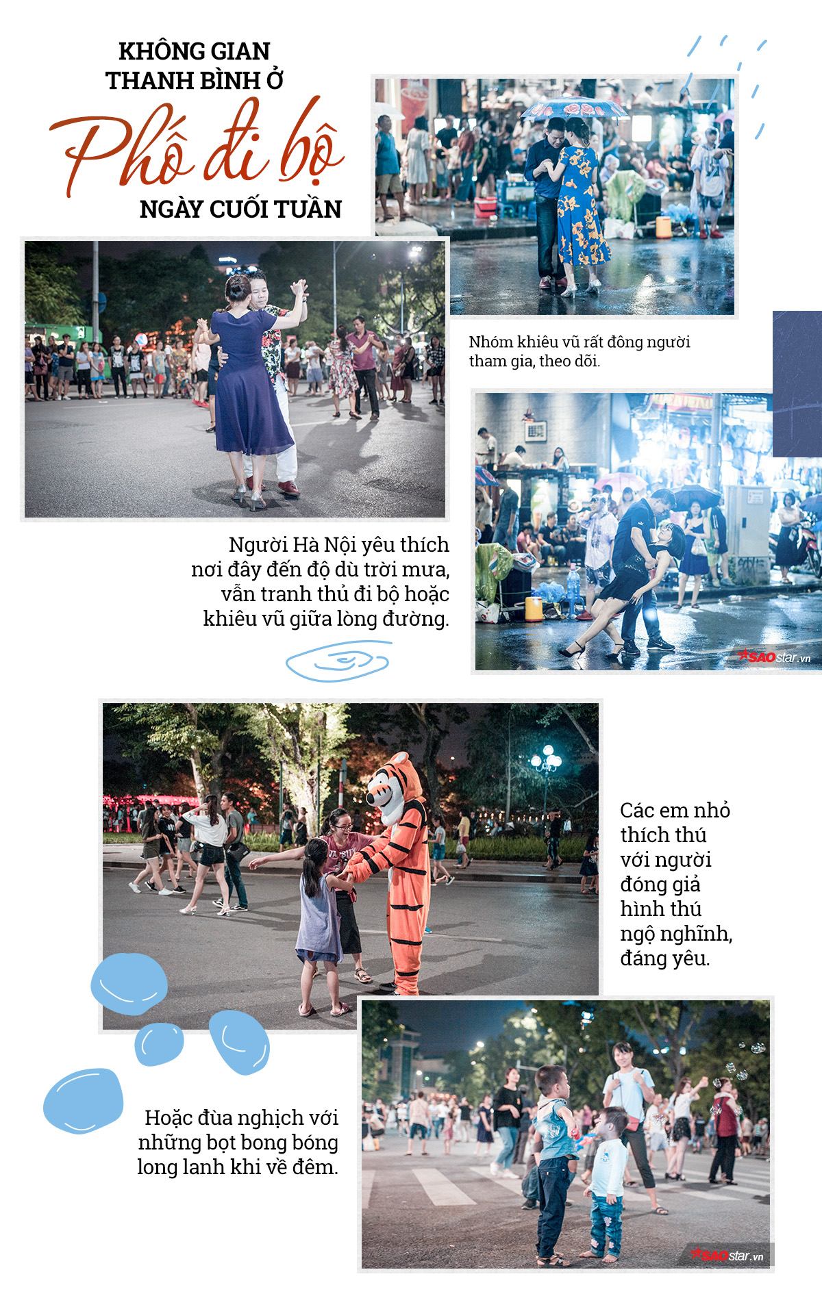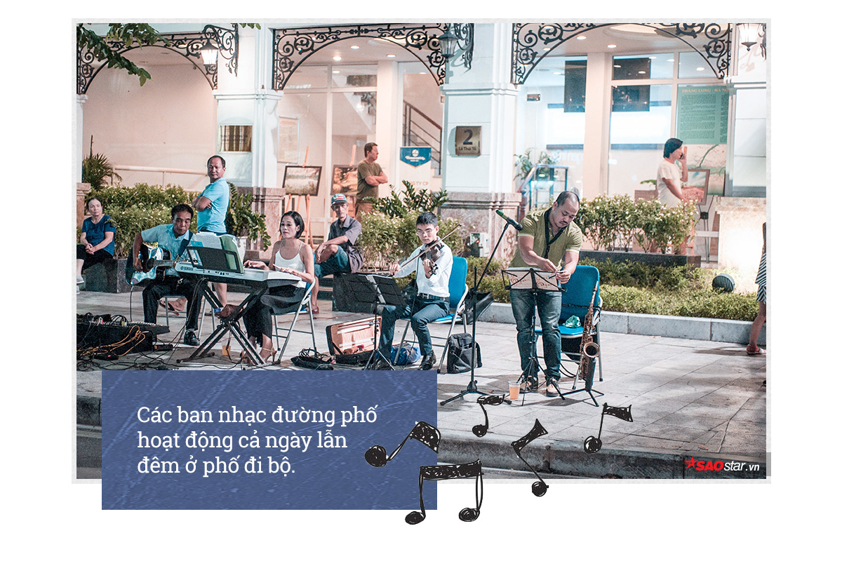 Không chỉ lưu giữ những giá trị cũ đáng trân trọng, phố đi bộ còn đẹp bởi rất nhiều người đang từng ngày, âm thầm điểm tô. Quanh hồ Gươm, cuối tuần nào cũng có 5-7 nhóm nhạc biểu diễn giữa đường phố. Bạn có thể nán lại xem, cho tiền hoặc không nhưng dù thế nào, những bản nhạc, lời ca ấy vẫn luôn vọng đến tai, chiêu đãi du khách một bữa tiệc âm thanh thịnh soạn.