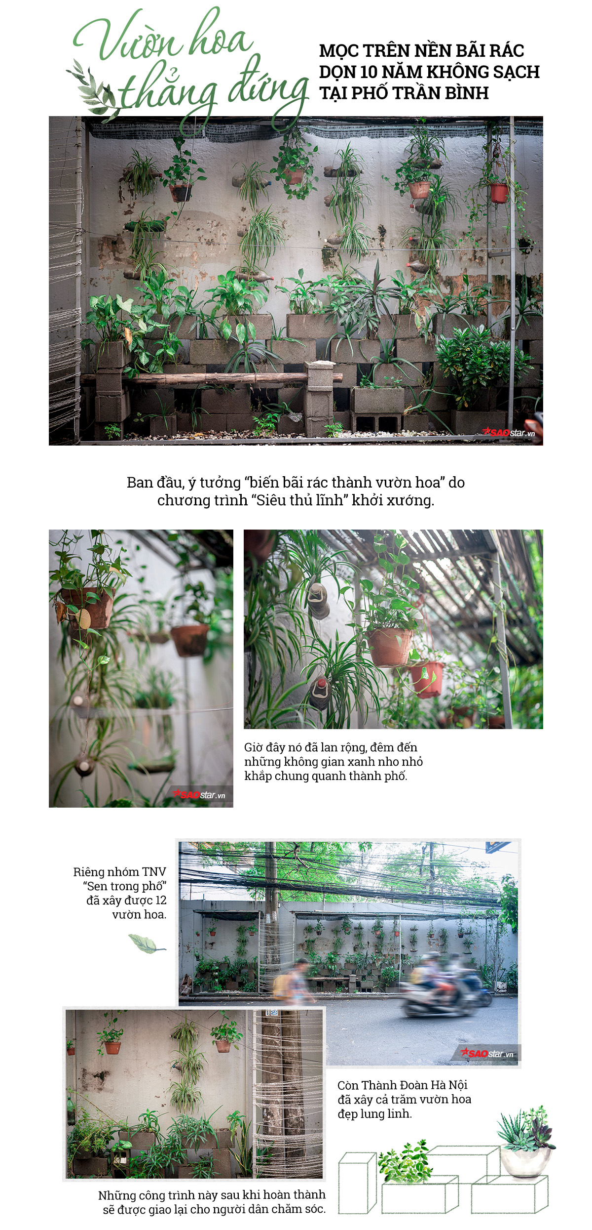 Chán vẽ tranh, dọn tường, người Hà Nội còn xây biết bao vườn hoa thẳng đứng trên nền bãi rác “dọn mãi không sạch”. Ý tưởng này ra đời từ cuộc thi Siêu Thủ Lĩnh rồi dần dần, những nhóm bạn trẻ, các đoàn thanh niên cấp phường ở khắp thành phố nhân rộng nó thành biết bao dự án. Theo thống kê mới nhất, đoàn Thanh niên đã xây được khoảng 100 vườn hoa như thế.