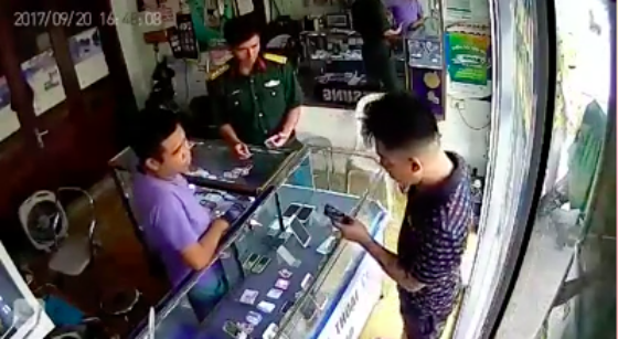 Vụ việc xảy ra vào khoảng 16h50 ngày 20/9 tại một cửa hàng điện thoại nằm trên phố Quan Nhân, phường Nhân Chính, quận Thanh Xuân, Hà Nội. Thời điểm này, chủ cửa hàng đang sửa máy cho một vị khách mặc quân phục. Một người đàn ông mặc quần đùi, áo phông tới xem điện thoại. Chỉ đứng được một lúc, anh ta bỏ đi, có lẽ là do thấy một người lính quân đội trong cửa hàng.