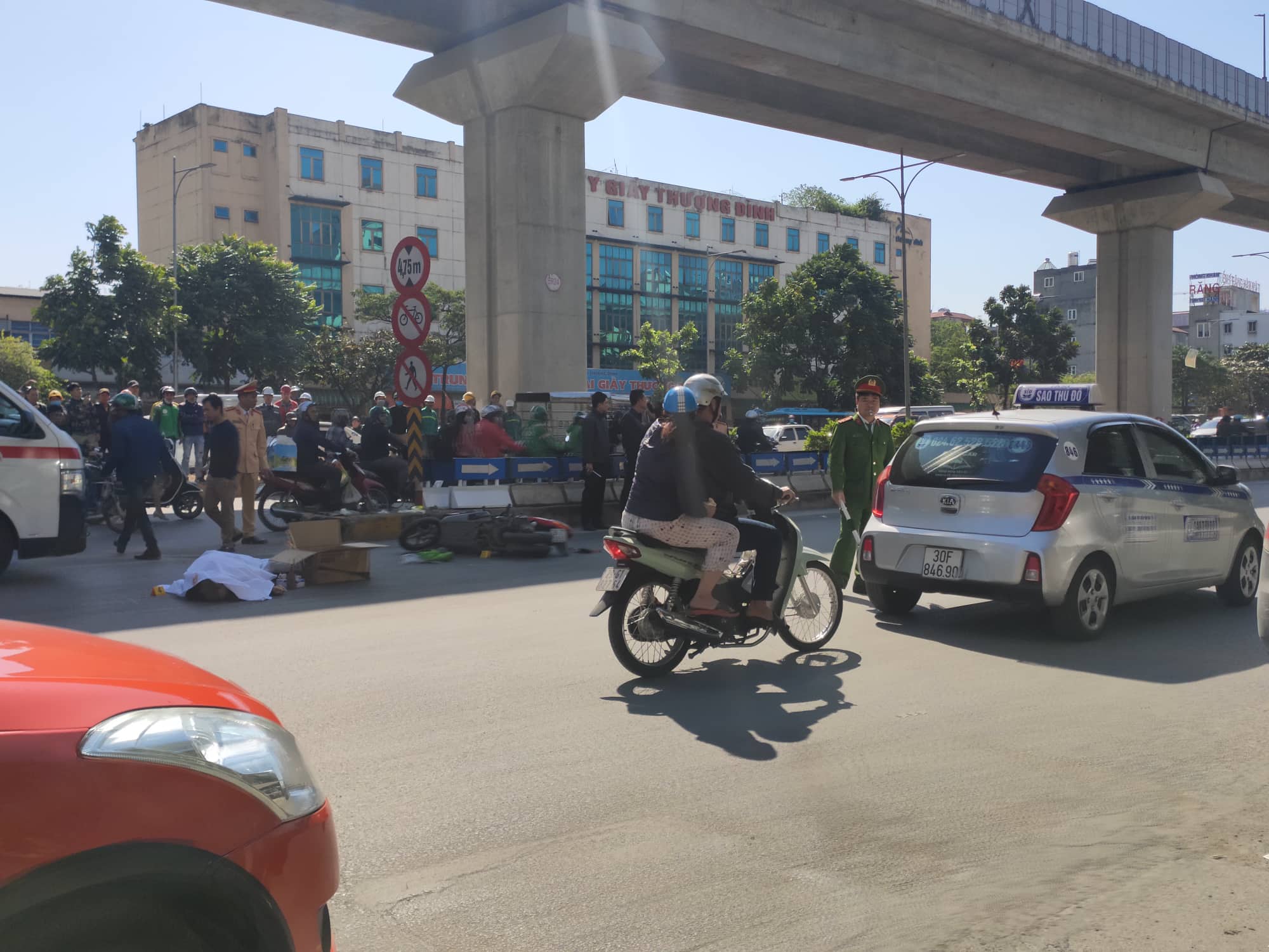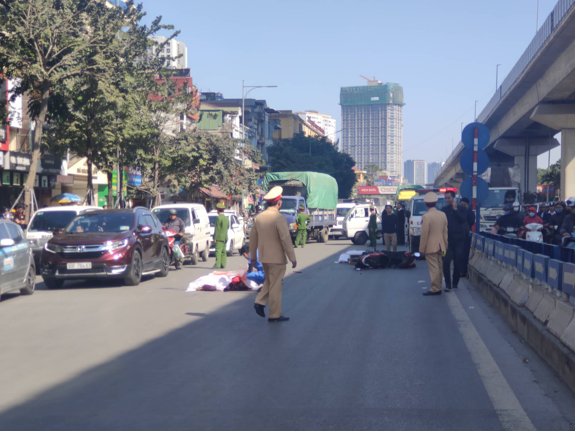 Tại hiện trường, chiếc xe máy bị hư hỏng nặng nằm giữa hai nạn nhân, giao thông ùn tắc theo hướng về ngã tư Nguyễn Trãi - Khuất Duy Tiến.