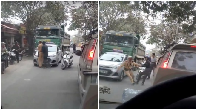 Mới đây, trên mạng xã hội xôn xao đoạn clip ghi lại hình ảnh một chiến sĩ CSGT trên địa bàn Hà Nội đang chặn xử lý chiếc xe tải vi phạm thì bị 2 đối tượng lao vào giằng co, cản trở.