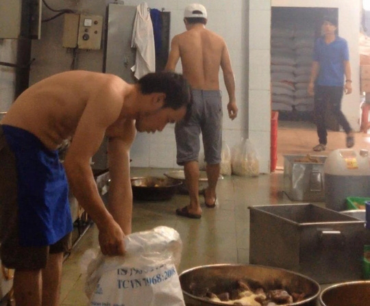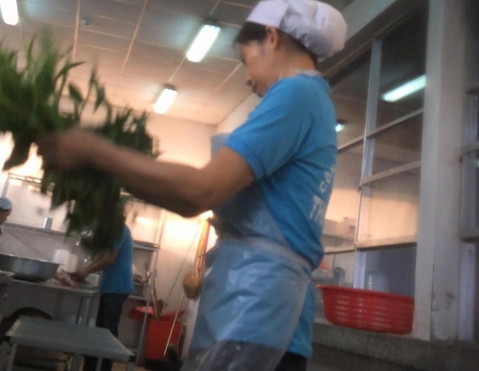 Sáng hôm sau, đầu bếp Tâm lấy từ trong tủ đông ra gần 50 kg thịt heo các loại bỏ xuống nền nhà để tan bớt đá. Sau đó, anh ta cùng với 2 người phụ bếp cắt mớ thịt này thành từng miếng nhỏ, dùng vòi nước xịt sơ mấy cái rồi đưa vào chế biến. Cá lóc mua từ chợ về cũng chỉ được nhân viên nhà bếp dùng vòi nước xịt mấy cái rồi để ráo nước. Nhiều con còn đầy vẩy, đất cát…