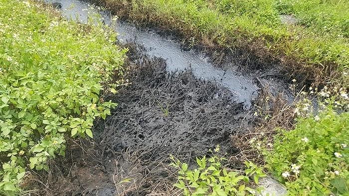 Ở khu vực bị đổ trộm chất thải, lớp thèo tây bị hóa chất làm thối rữa, nổi trên mặt nước đen ngòm, bốc mùi hôi khó chịu. Xung quanh nơi có loại chất thải này cây cỏ đều bị chết cháy.
