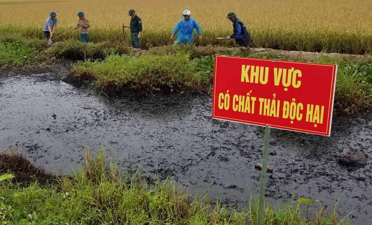 Chính quyền địa phương sau đó đã huy động lực lượng đắp bờ khoanh vùng để tránh nước mưa làm chất độc lan rộng. Xã cũng đã căng dây, đặt biển báo nguy hiểm, có hóa chất để đảm bảo an toàn cho người dân.