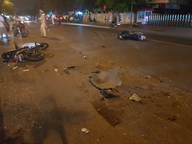 Tại hiện trường, chiếc xe ô tô gây tai nạn bị hư hỏng nặng. Xe máy của 7 nạn nhân bị biến dạng, nằm la liệt.