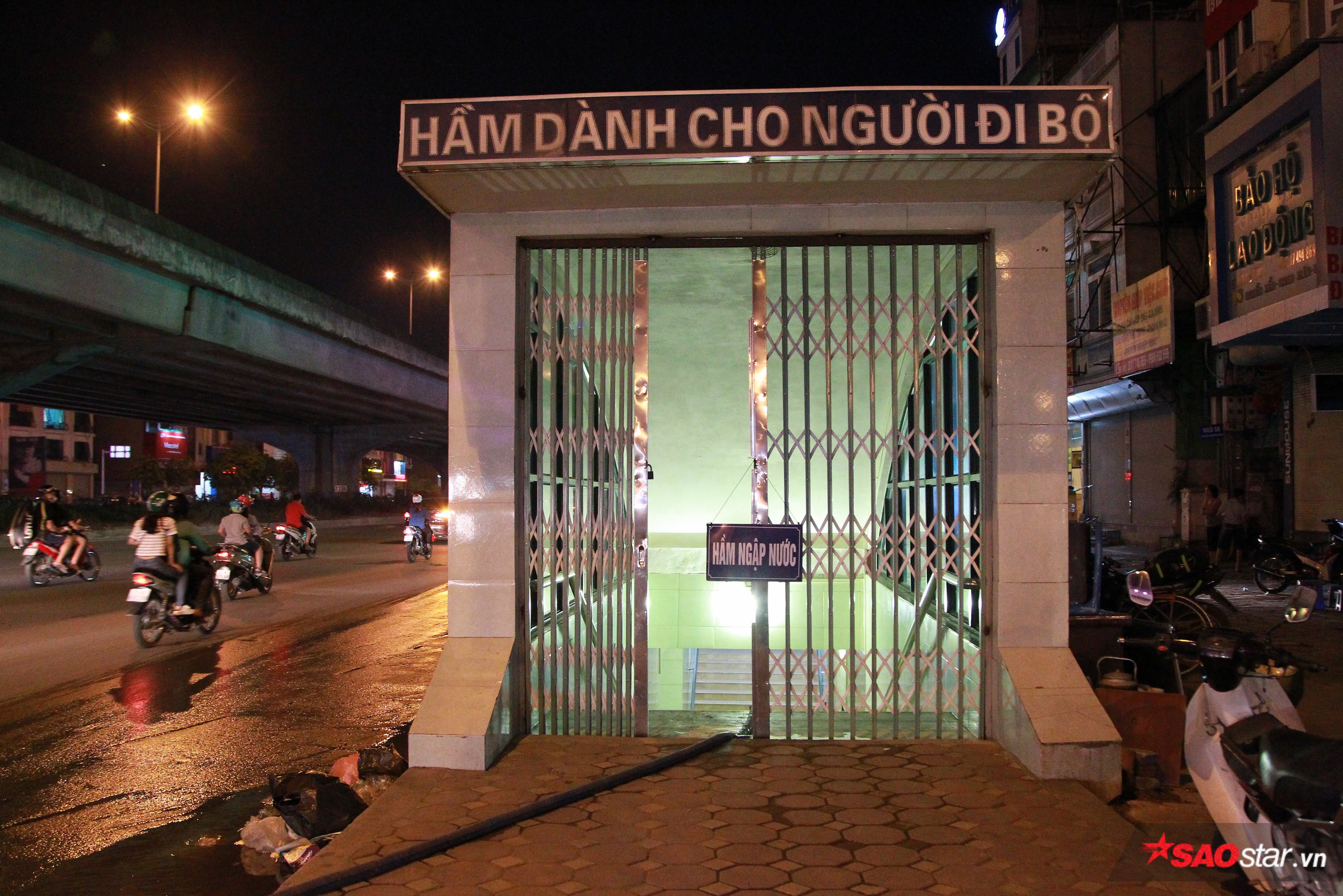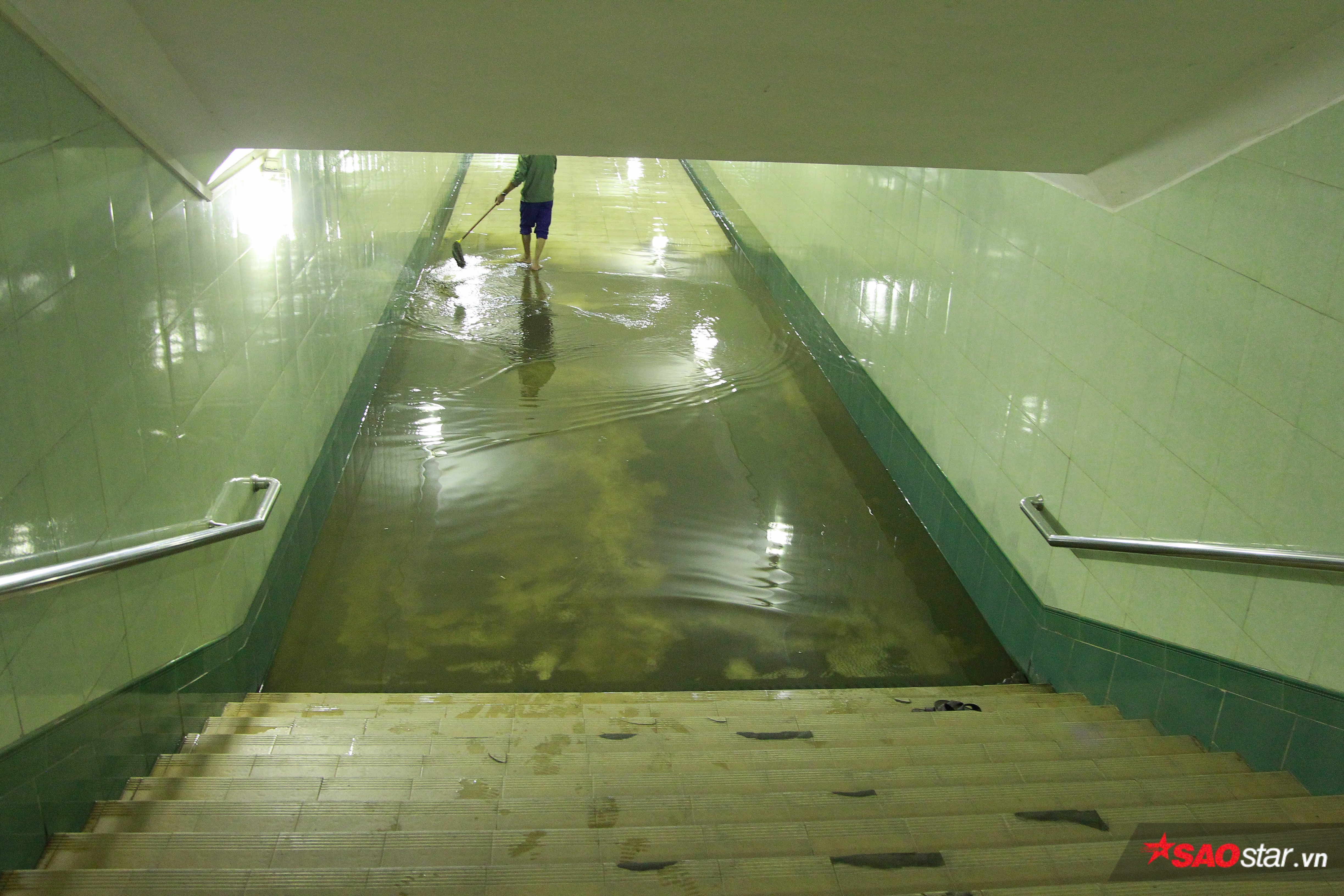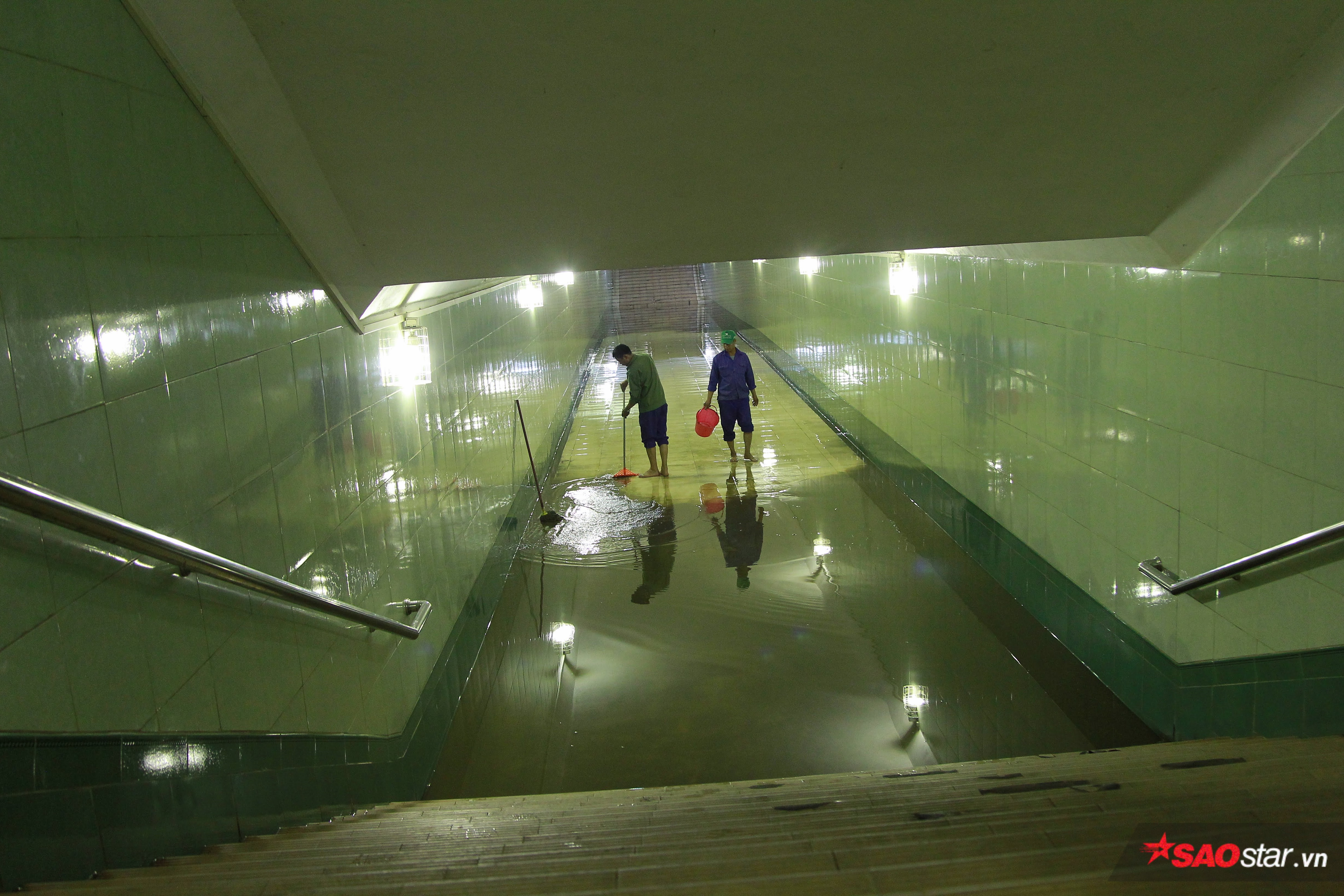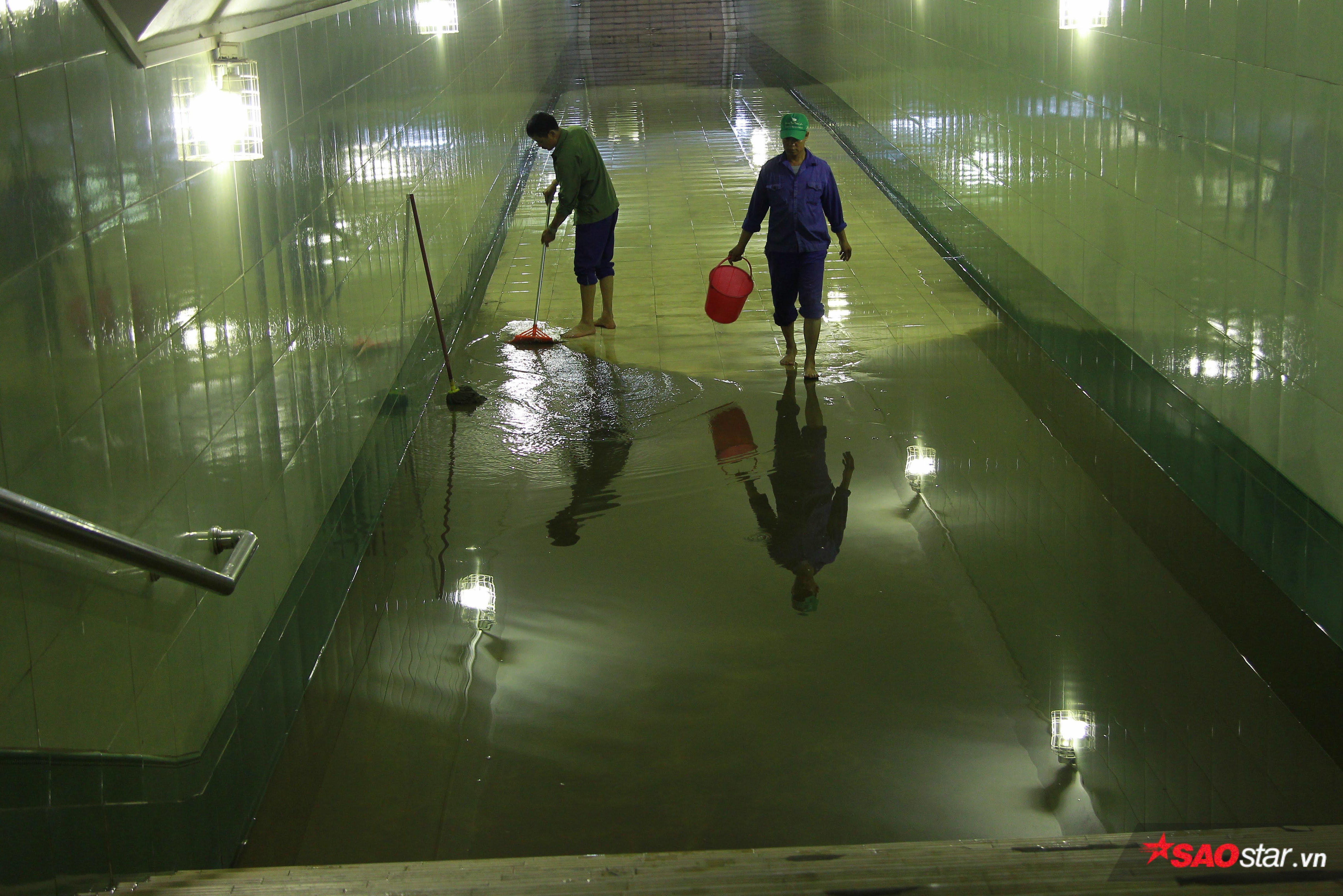 Theo ghi nhận của PV, đến tối 13/5, tại hầm đi bộ đầu ngã tư Nguyễn Xiển, công nhân vẫn đang dọn vệ sinh và hút nước trong hầm ra ngoài.