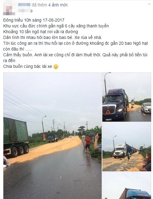 Theo một số người dân chứng kiến cho hay, do ngô rơi vãi trên một đoạn đường quá dài nên tài xế container không còn cách nào khác chạy khắp nơi năn nỉ mọi người đừng lấy. Thế nhưng, mặc cho tình cảnh đáng thương của người đàn ông này, nhiều người dân vẫn tiếp tục thi nhau mang về. Theo một số người chứng kiến: Khoảng 10 tấn ngô trên xe nhưng đến khi thu gom trao lại thì chỉ còn khoảng 20 bao.