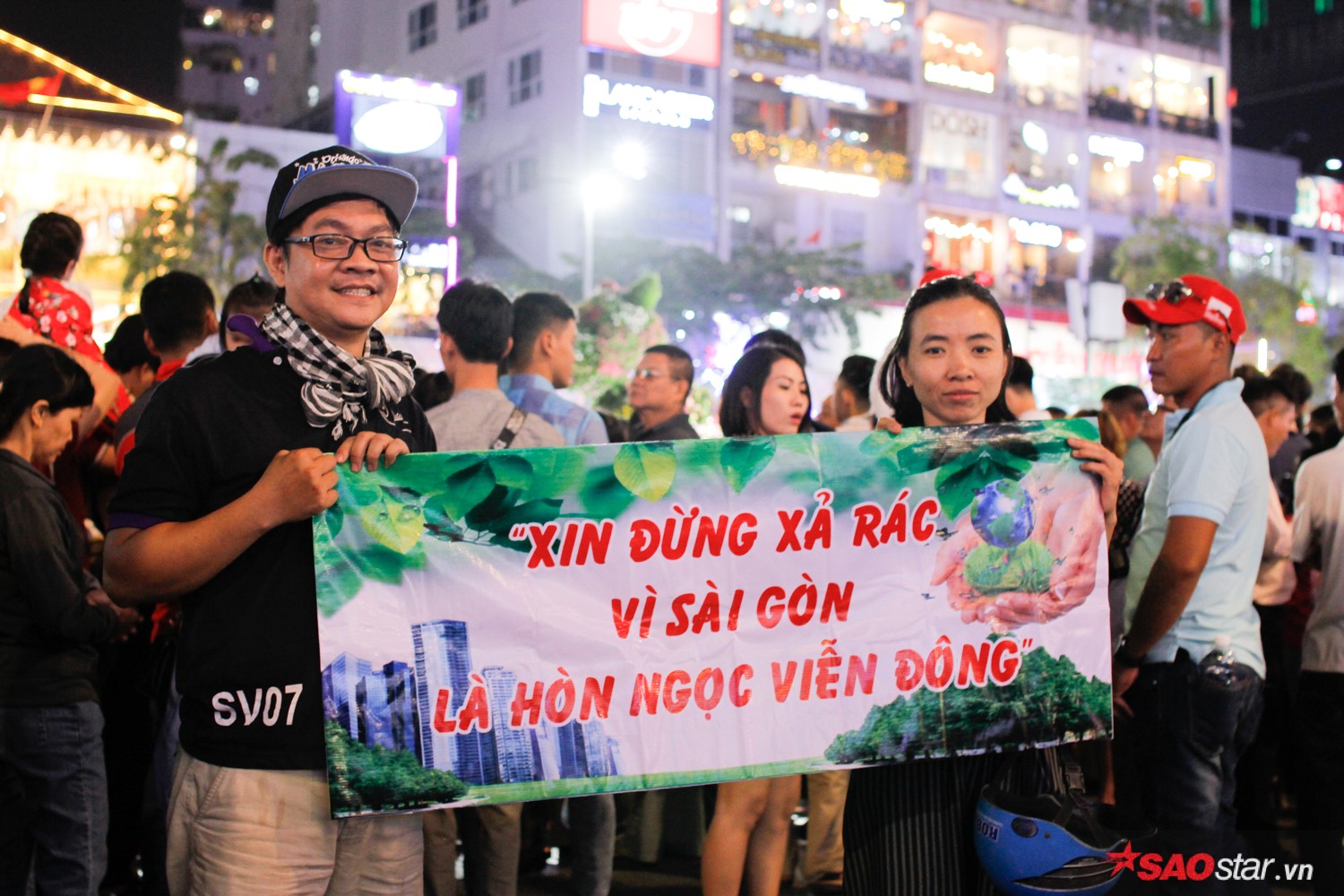 Trong hàng ngàn người đó, chúng tôi bắt gặp nhóm thiện nguyện của bạn Châu Thế Toàn (ngụ Gò Vấp, TP. HCM). Toàn chia sẻ suốt 13 năm qua, năm nào cũng ra đường hoa Nguyễn Huệ giơ băng rôn kêu gọi mọi người không xả rác để giữ cho thành phố sạch đẹp hơn mỗi độ xuân về. “Mục đích của tụi em cũng chỉ nhắc nhở, nâng cao ý thức của mọi người, với hi vọng góp phần nhỏ giúp Sài Gòn trở nên sạch sẽ hơn!”, Toàn chia sẻ.