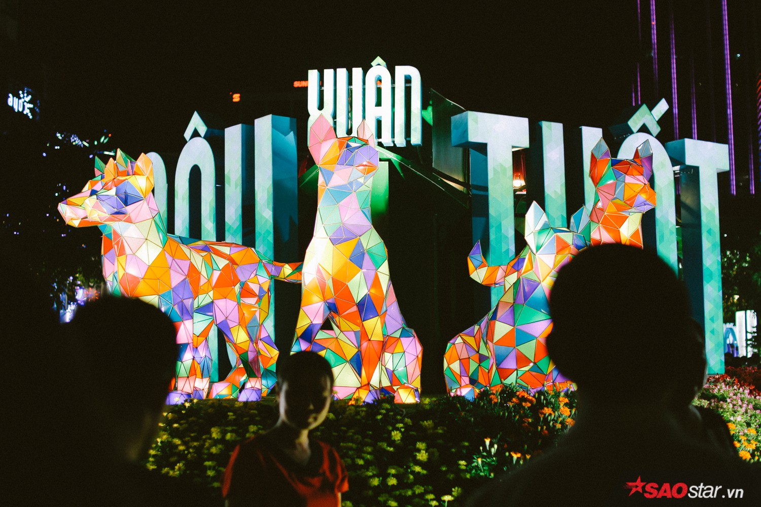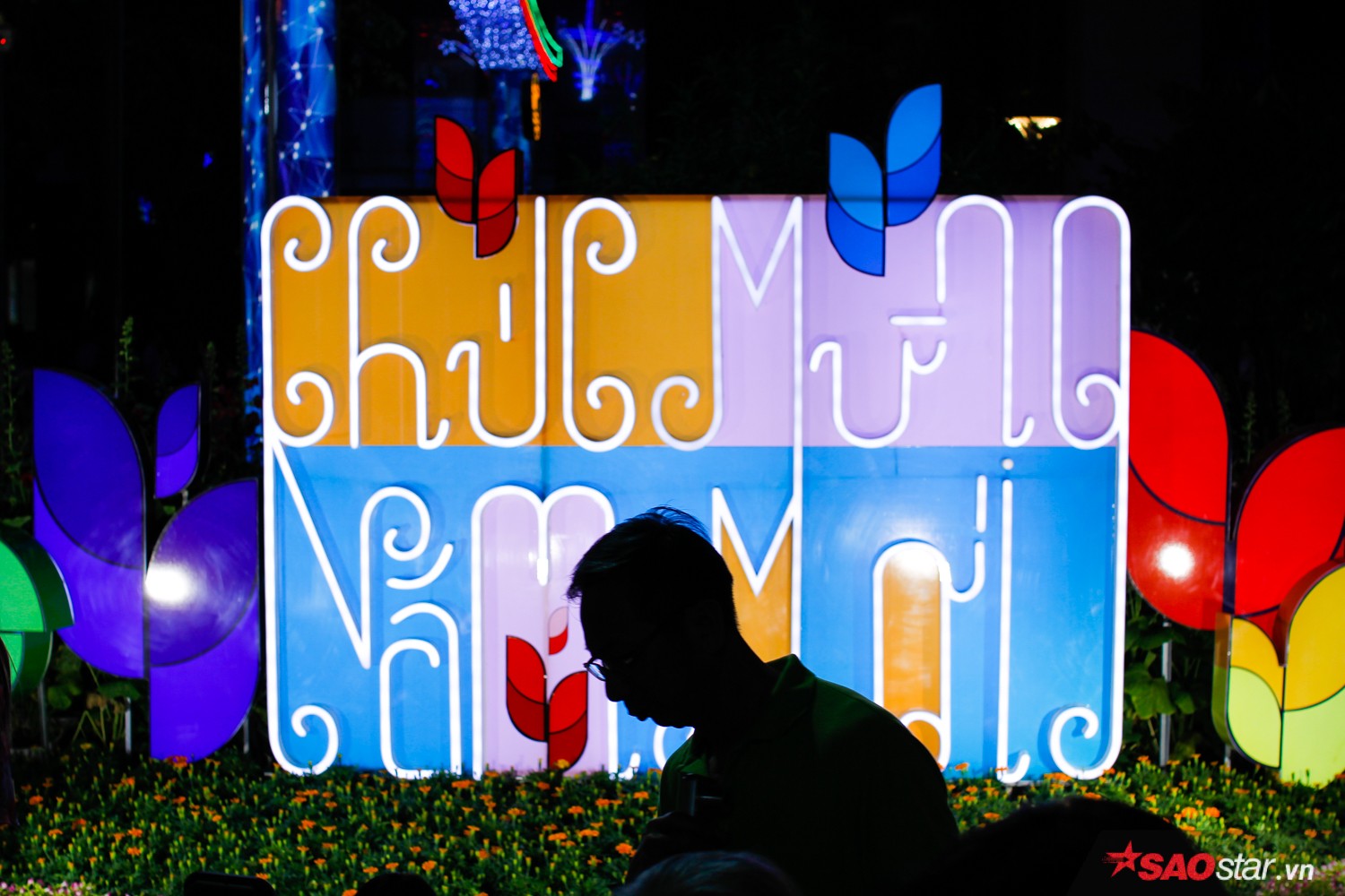 Các mô hình, tiểu cảnh ở đường hoa Nguyễn Huệ lấp lánh đủ màu sắc ánh sáng trong đêm.