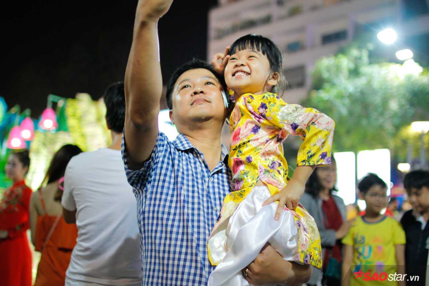 Hai bố con cùng chụp ảnh lưu niệm tại phố đi bộ.