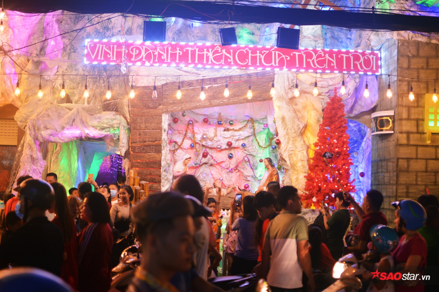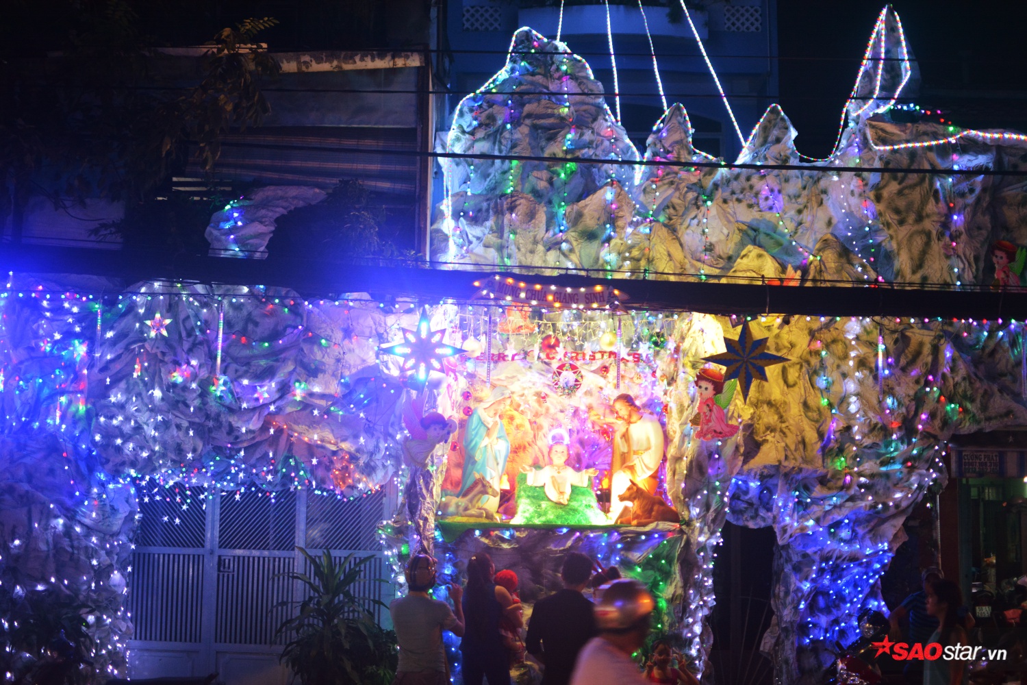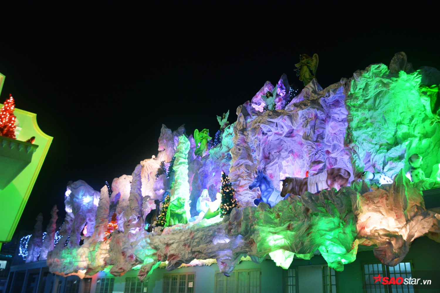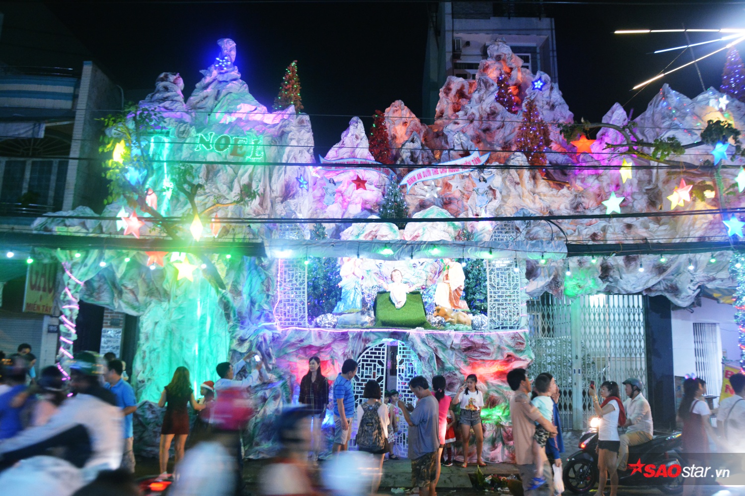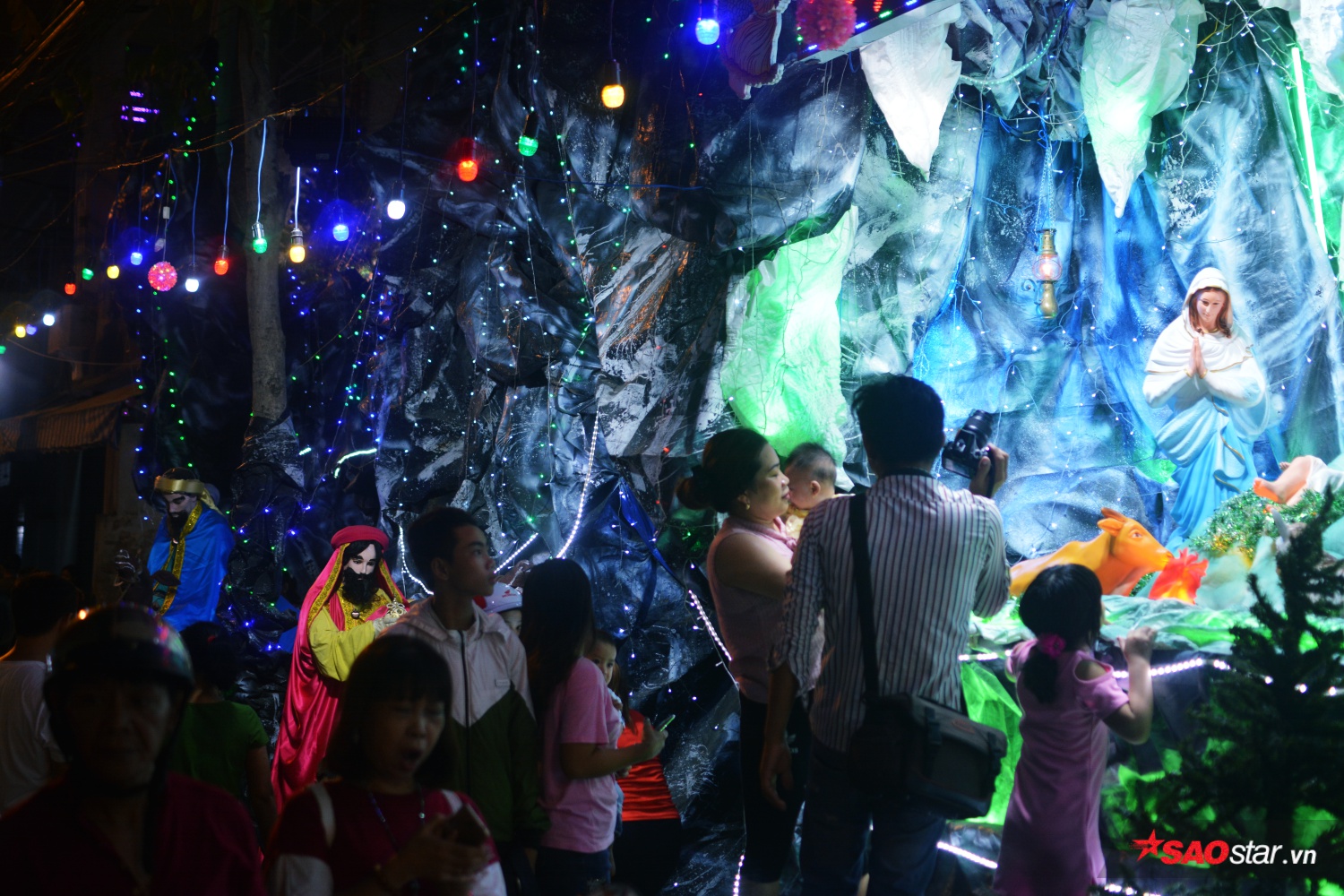 Theo đó, dọc con đường, các hộ dân đều đã trang trí đèn hoa đẹp mắt, xây dựng nhiều hang động đá “khồng lồ” được mô phỏng giống thật, để biểu trưng nơi Chúa ra đời. Ánh đèn màu lung linh khắp lối đi là những điểm nhấn khiến người tham quan vô cùng thích thú.