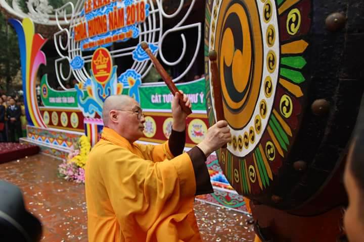 Đúng 9h thượng tọa Thích Minh Hiền, trụ trì chùa Hương đánh trống khai hội năm 2018.
