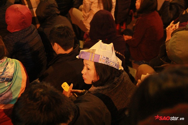 Vì thời tiết lạnh và có sương nên nhiều người chuẩn bị sẵn áo ấm. Trong ảnh một người phụ nữ dùng báo gấp mũ ca lô đội đầu.