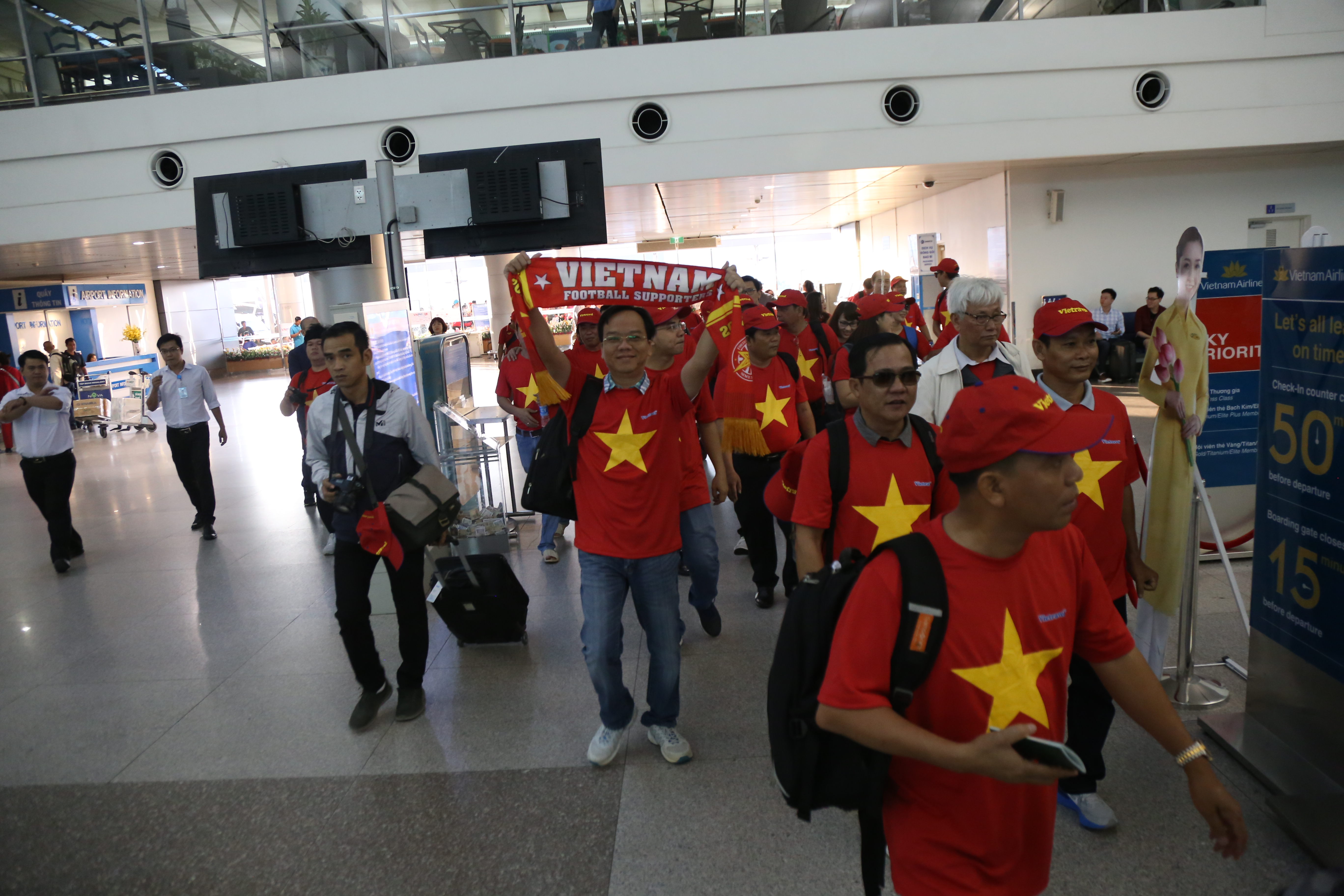 Các CĐV đến từ khá sớm để kịp chụp hình lưu niệm, tạo ra không khí khá cuồng nhiệt tại khu vực nhà chờ sân bay. Tất cả đều chuẩn bị chu đáo từ các băng rôn, cờ phướn, áo thun cổ động, kèn trống… Những nụ cười và ánh mắt vui vẻ của hàng trăm CĐV với hy vọng “tiếp lửa” cho đội tuyển Việt Nam thi đấu hết mình, mang vinh quang về cho Tổ quốc.