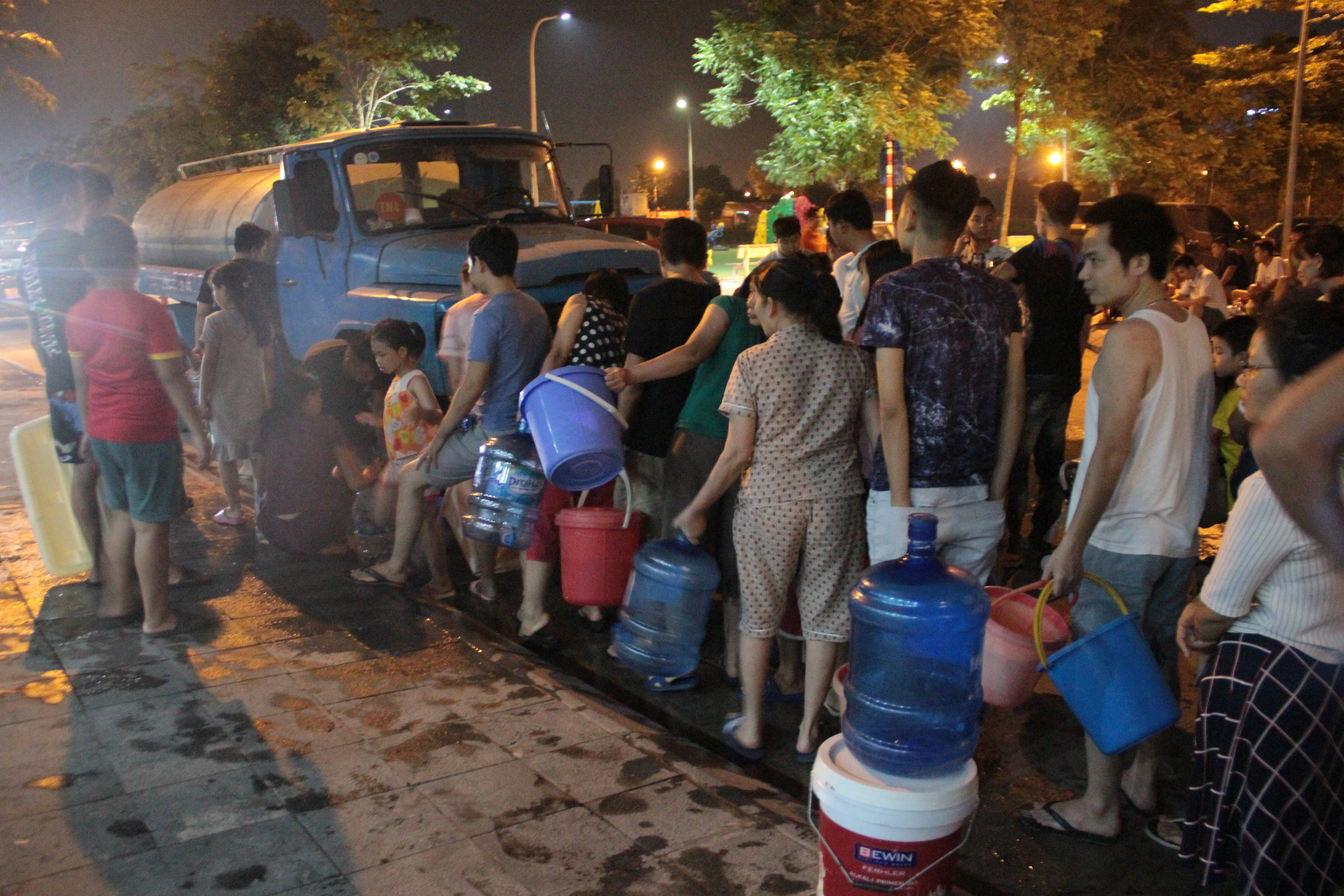 Khuya ngày 15 rạng sáng 16/10, hàng trăm cư dân chung cư Gemek 1 (Hoài Đức, Hà Nội) xách theo can nhựa, chai lọ… xếp hàng dài lấy nước sạch từ nhà máy nước Hà Nội để dùng tạm sau thông tin nước sông Đà nhiễm dầu bẩn.