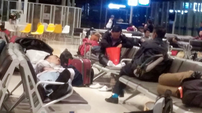Phải đến 2h sáng 15-2, nhân viên hãng Jetstar Pacific mới thông báo hủy chuyến nên nhiều người không thể tìm được nhà nghỉ, đành phải ngủ lại sân bay trong tiết trời lạnh giá - Ảnh: CTV