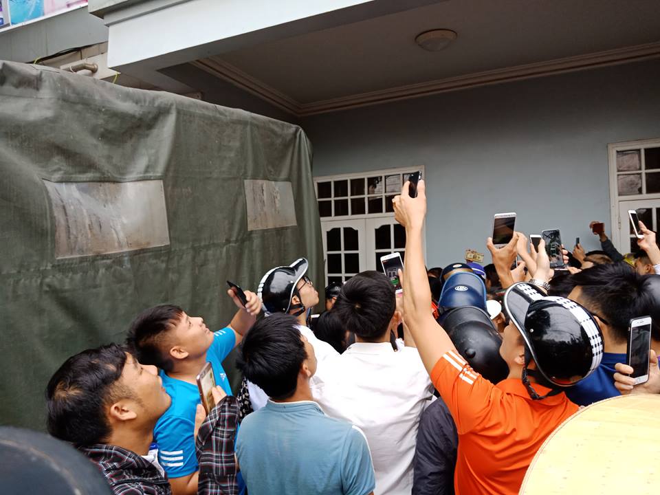 Hàng trăm người dân theo dõi bên ngoài.