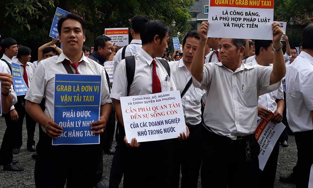 Tài xế Vinasun cầm trên tay các biểu ngữ phản đối Grab. Ảnh: Vietnamnet.