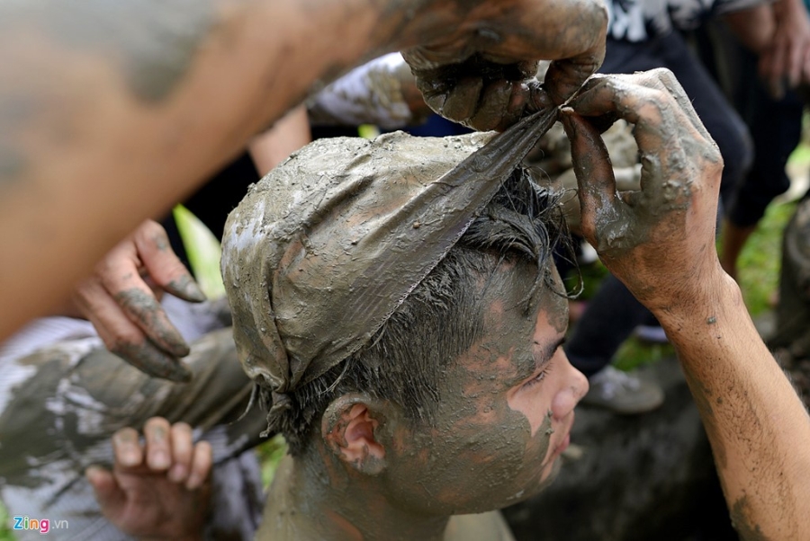 Sau khi tắm rửa sạch sẽ, ba thanh niên được đưa ra đồng để trát bùn khắp người, bắt đầu hóa thân thành bụt. Khu vực tắm bùn (cách đền chính 200 m) được xây theo thiết kế tiêu chuẩn riêng biệt, lượng bùn cũng được thanh lọc từ các thửa ruộng bên cạnh nên rất sạch sẽ.