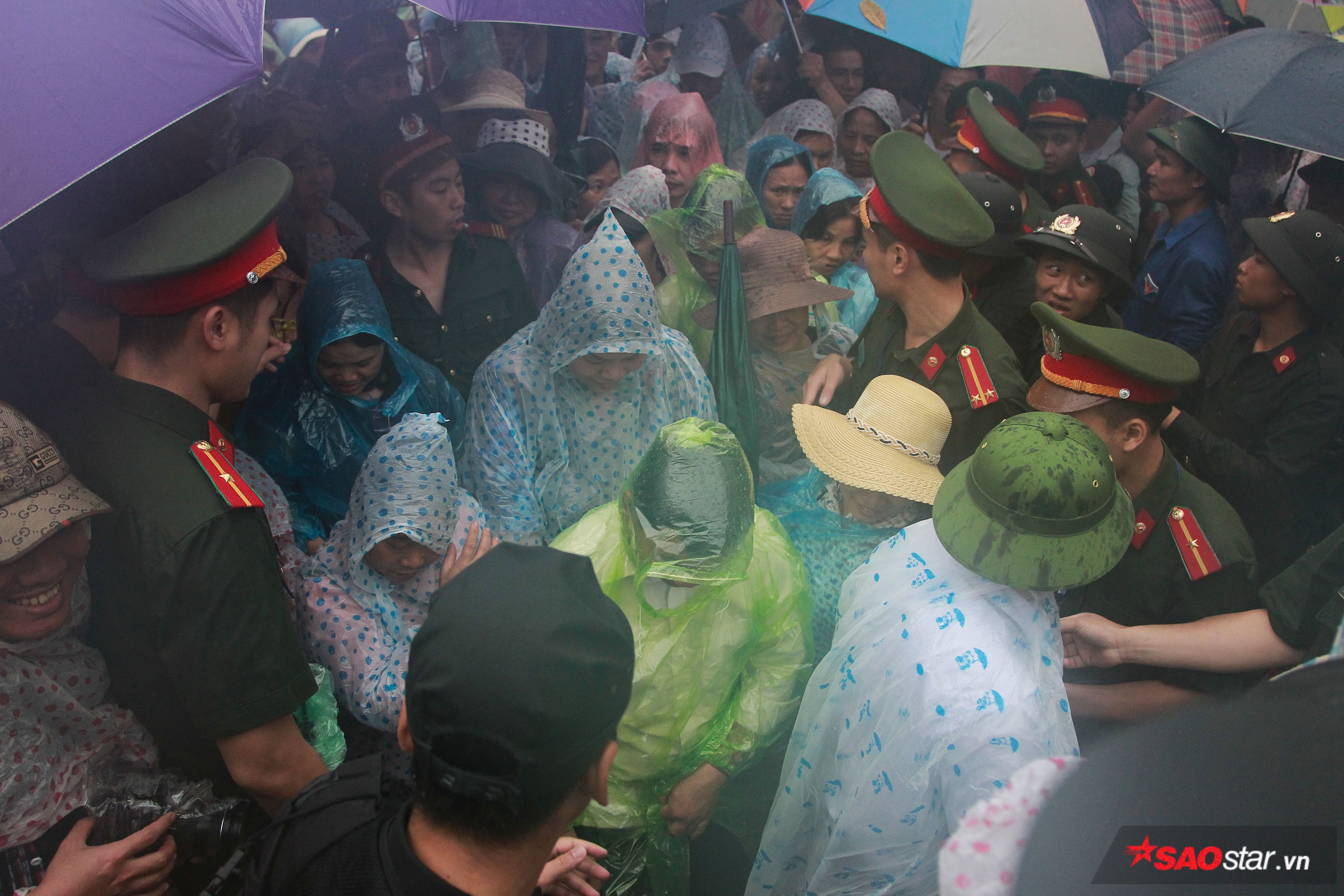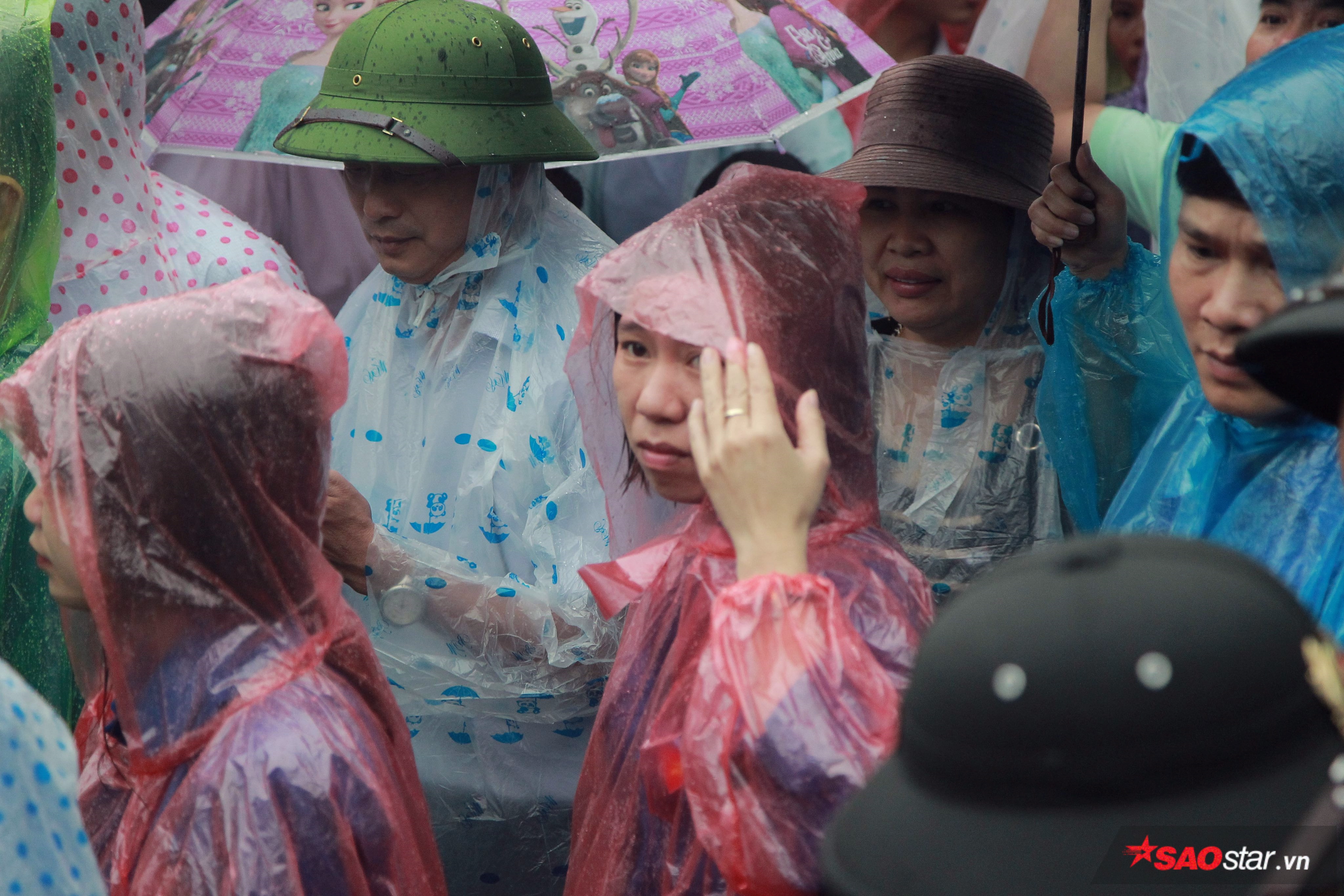 Dòng người mặc áo mưa, che ô tiến về phía trước hàng rào, chờ đợi để được vào bên trong dâng hương.