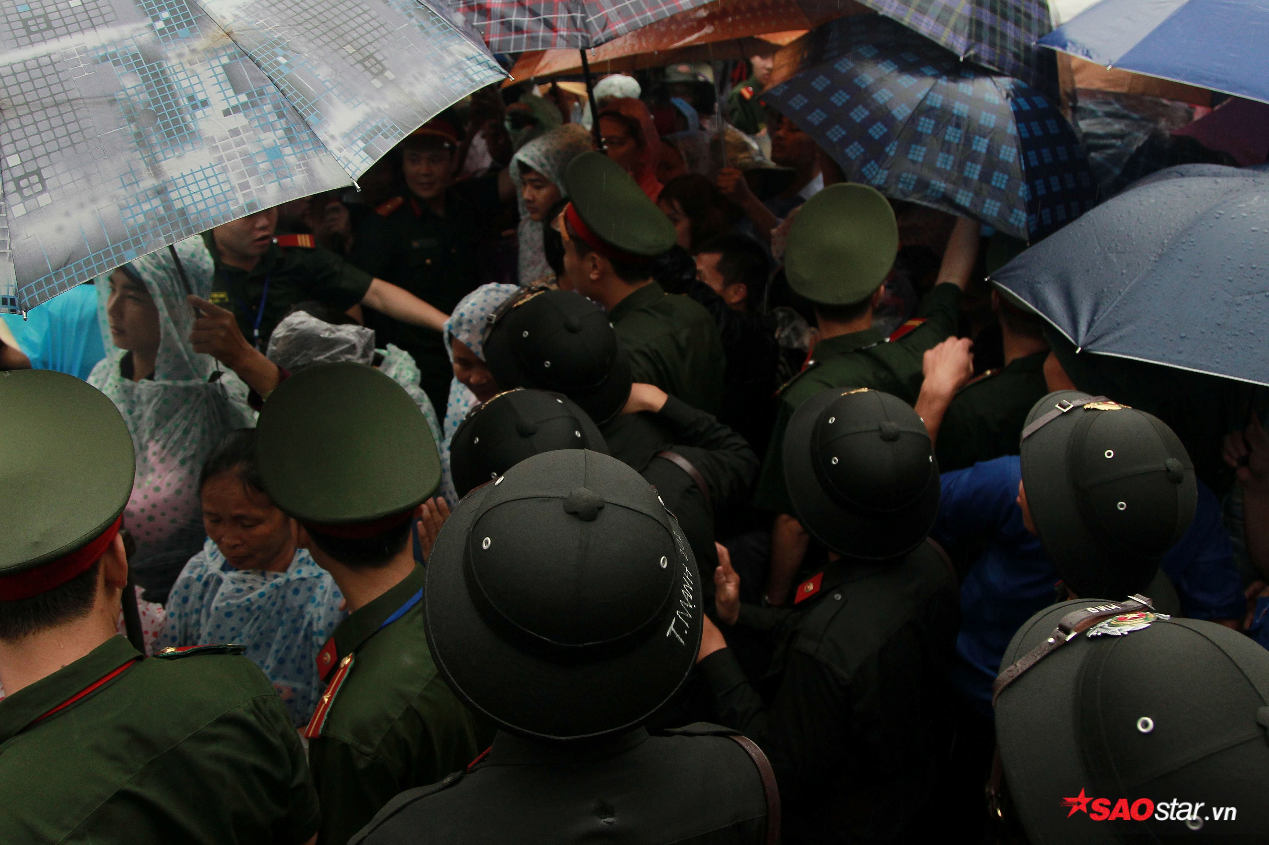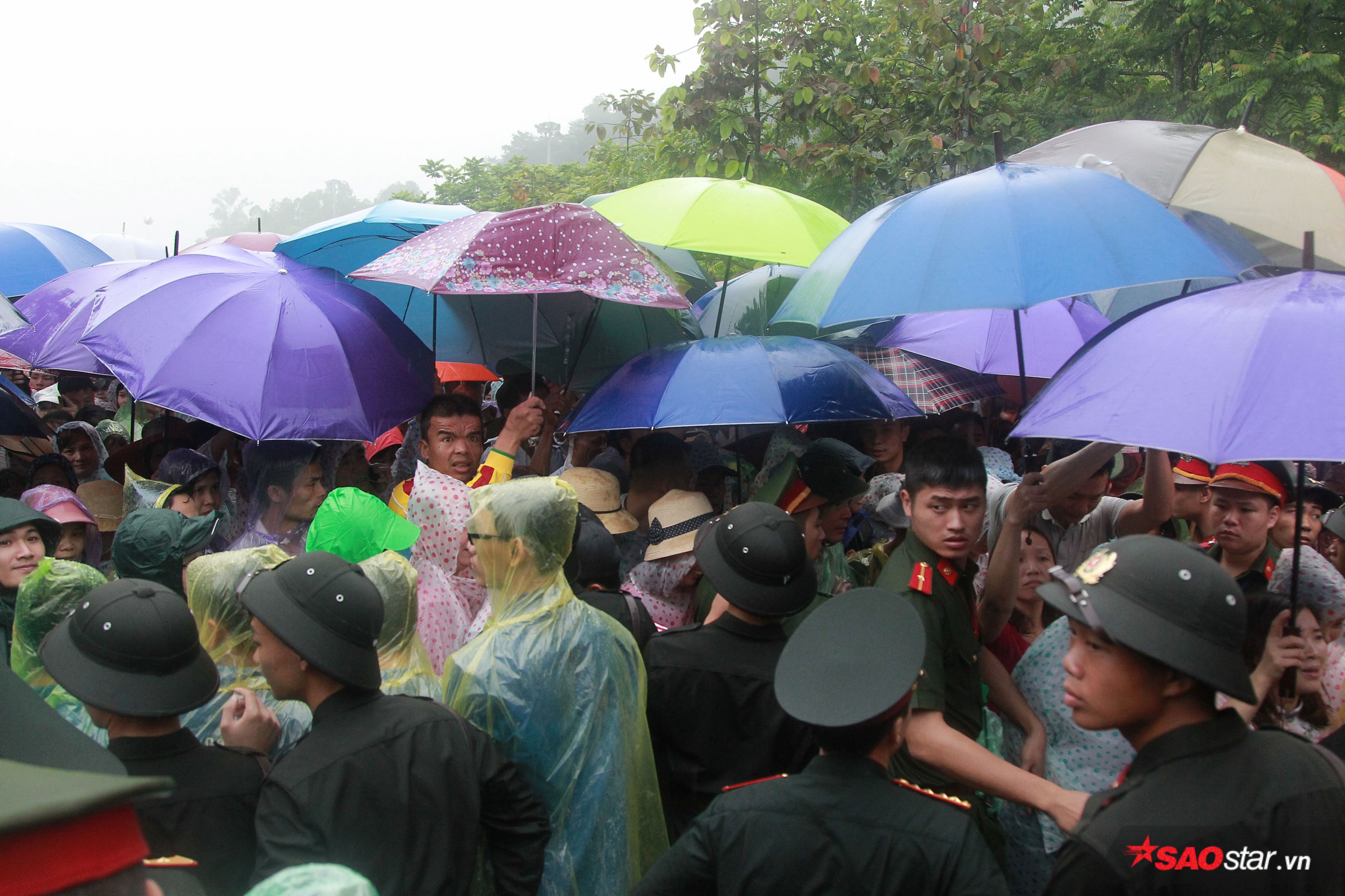 Tại các điểm chốt hàng rào trong khuôn viên đền, lực lượng chức năng cùng thanh niên tình nguyện vẫn đứng dưới mưa để đảm bảo an ninh cho lễ hội.