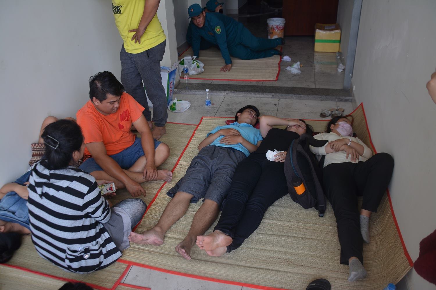 Hiện tại, lực lượng PCCC đang tích cực thu dọn hiện trường. Người dân nằm la liệt mọi nơi ở chung cư vì mệt mỏi.