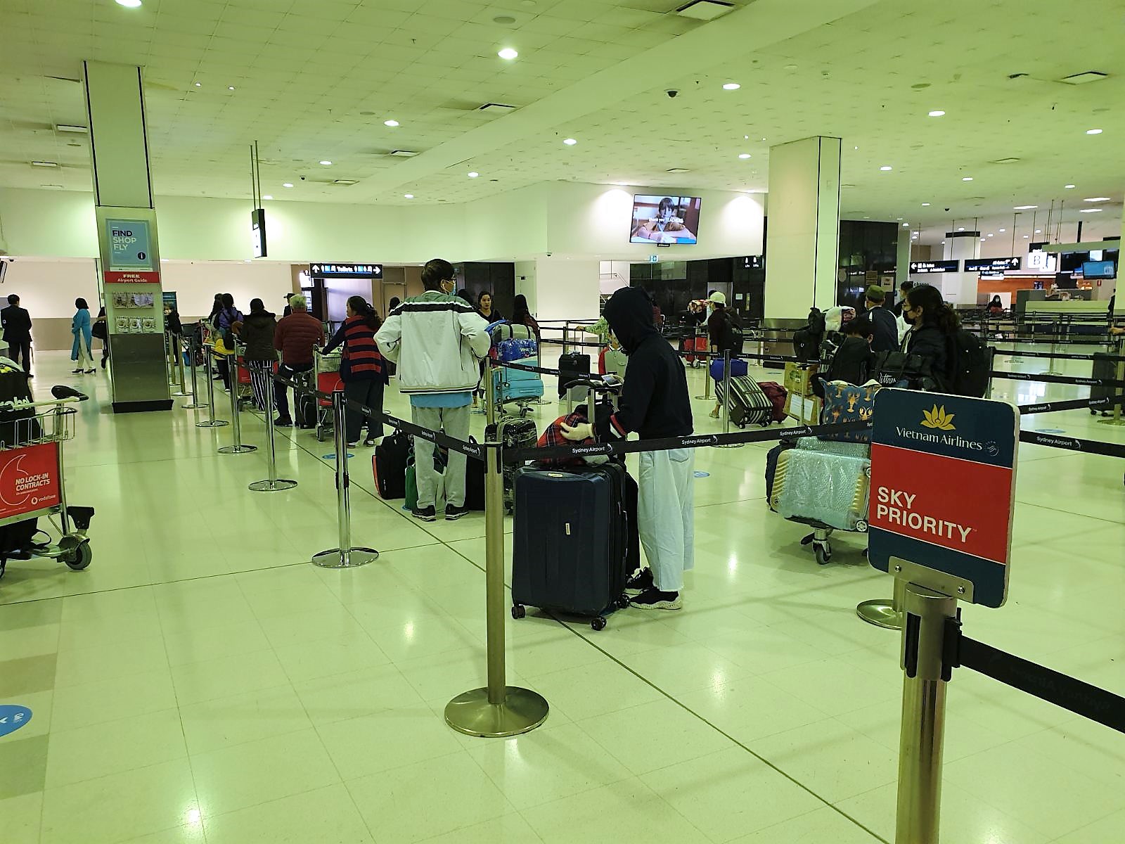Hành khách xếp hàng chuẩn bị làm thủ tục lên máy bay.