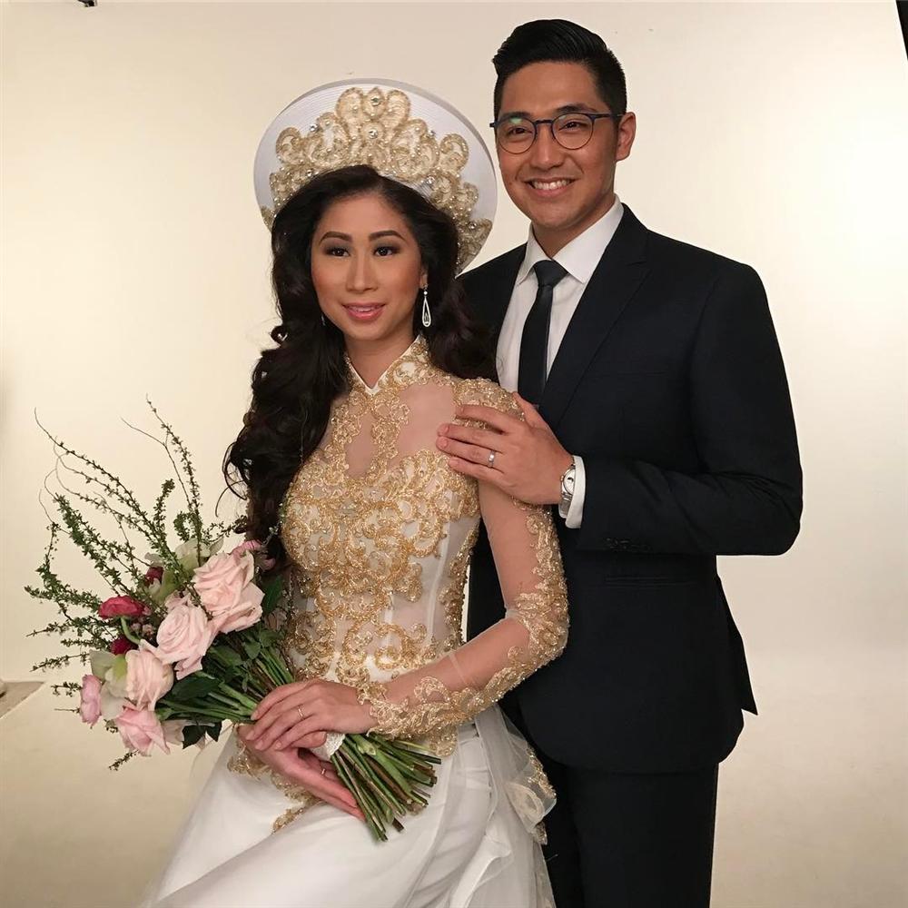 Cô dâu Stephanie đẹp nền nã trong trang phục truyền thống áo dài và khăn đóng.