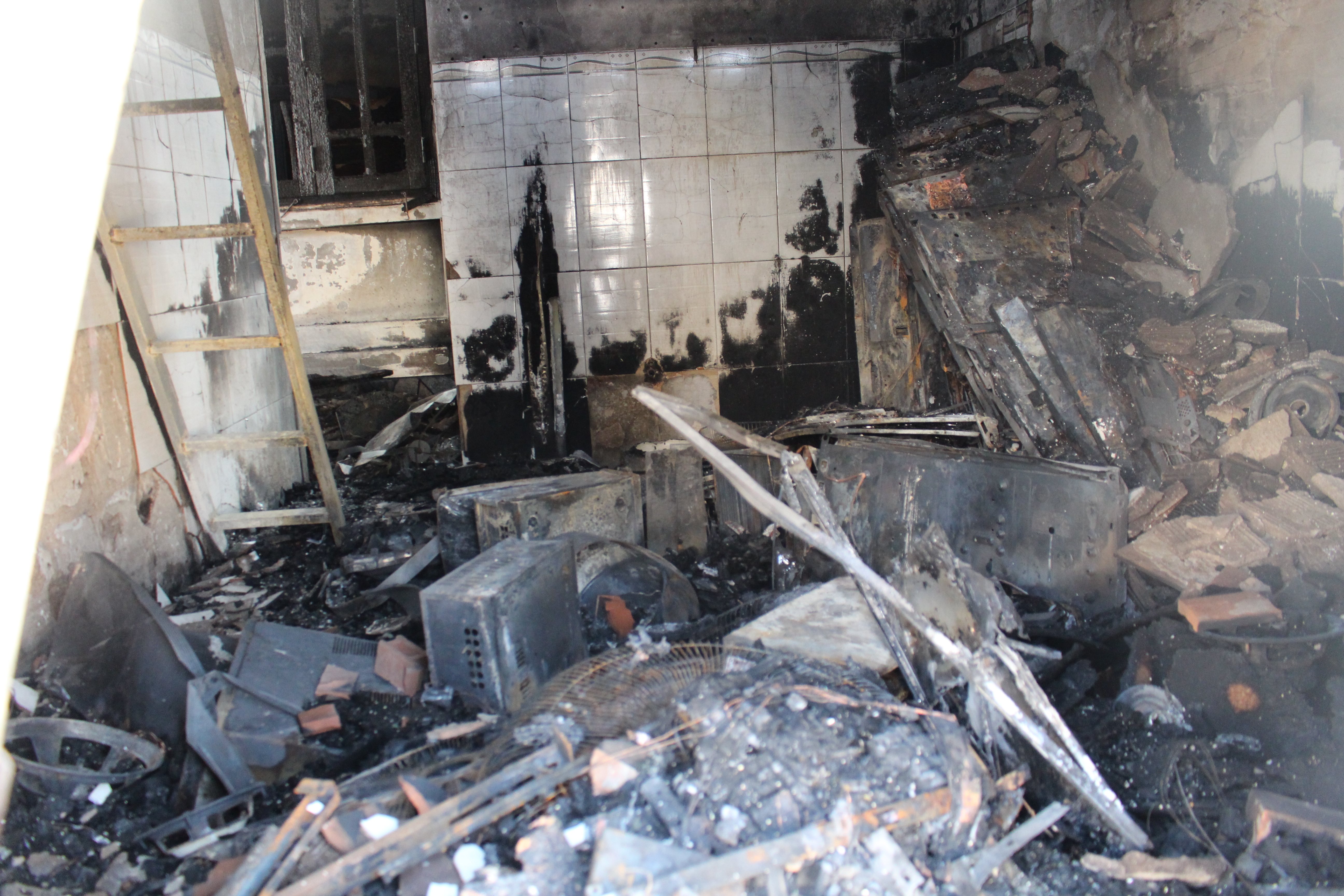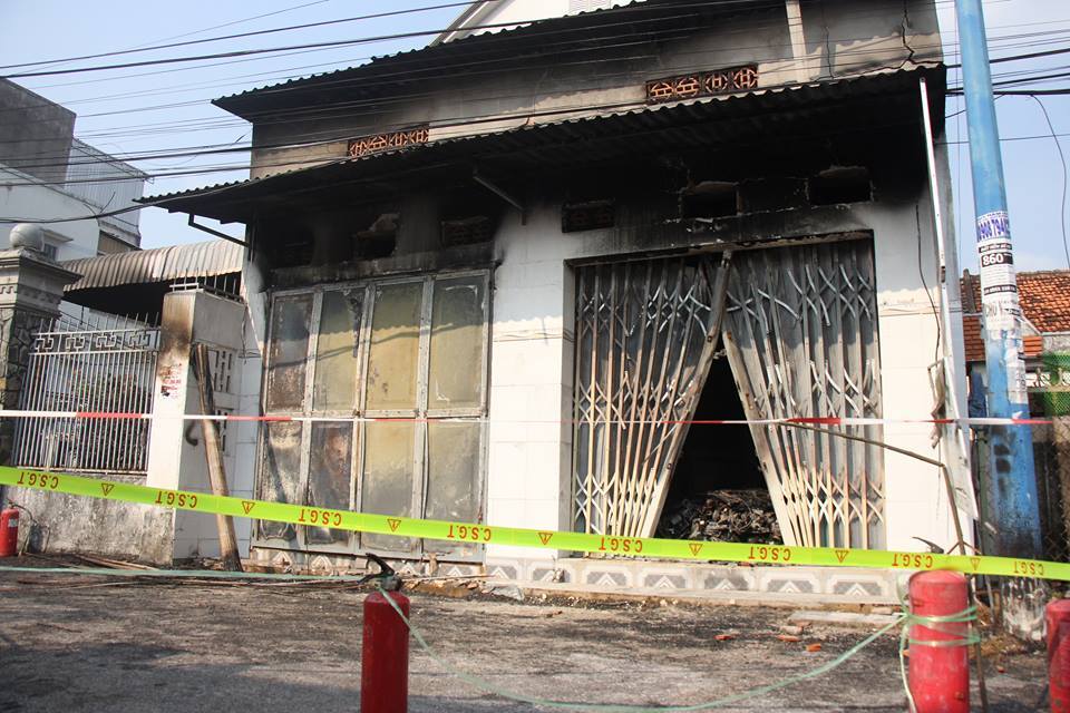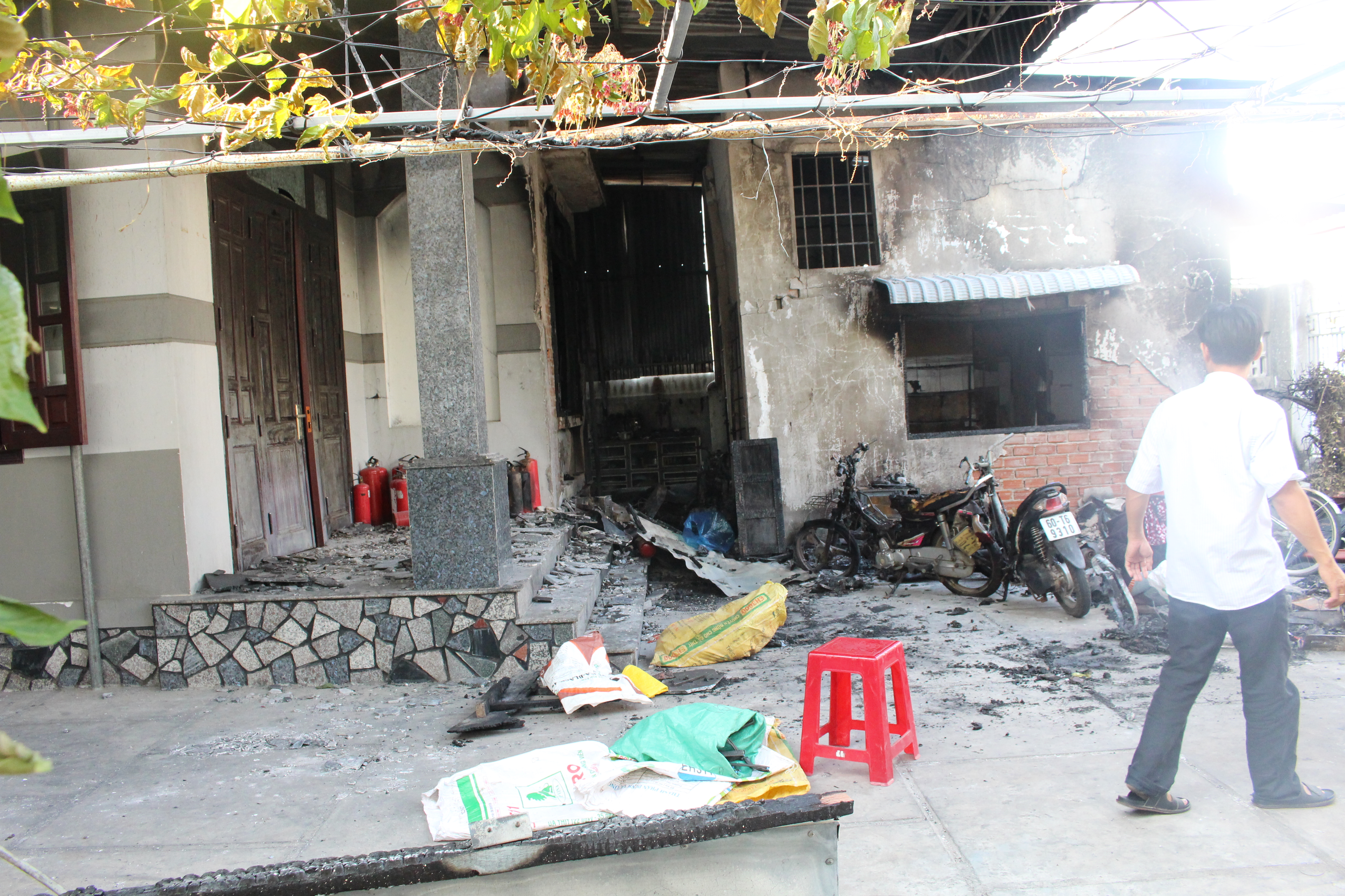 Căn nhà 2 tầng ở địa chỉ 15 Lê Thành Duy bên cạnh của chủ tiệm ũng bị cháy xém tầng trệt, hư hỏng đồ đạc trong phòng khách.