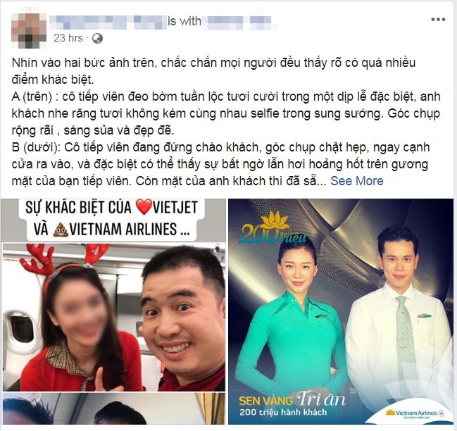 Chụp ảnh không được, anh về ghép hai tấm ảnh đại diện hai hãng bay sát nhau và thoá mạ bạn nhân viên nữ khi bạn đang khoác màu áo đại diện cho hãng hàng không mà bạn đang làm việc. Tự nhiên thấy thương bạn nữ ghê, khi không cái bị bóc phốt, trong khi bạn có làm gì sai đâu”.