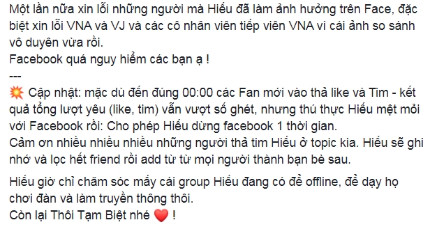 Hiếu Orion gửi lời xin lỗi tới 2 nữ tiếp viên và tuyên bố dừng sử dụng Facebook, tập trrung vào dạy đàn, vẽ tranh