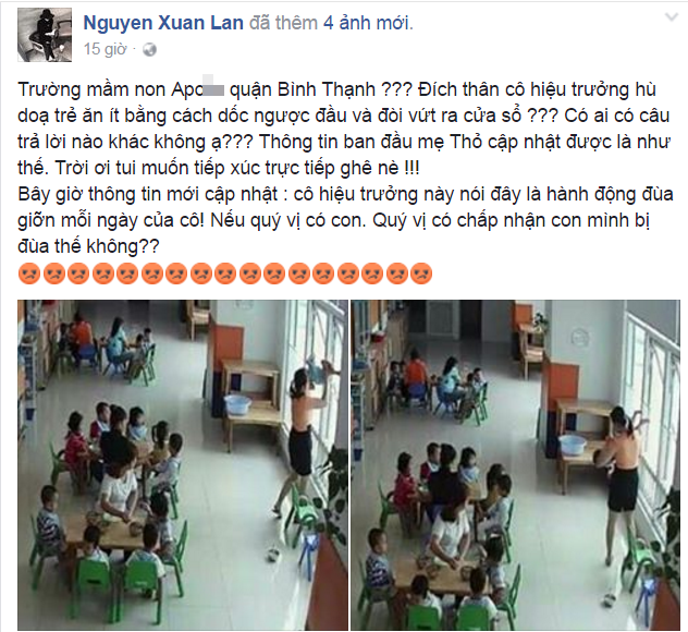 Hiện nay, trên mạng xã hội đang xôn xao trước sự việc bạo hành trẻ em xảy ra tại trường mầm non Apo. (quận Bình Thạnh, TP.HCM) khi những hình ảnh được cắt ra từ camera của ngôi trường cho thấy hiệu trưởng đã có hành động dọa trẻ biếng ăn bằng cách dốc ngược đầu và đòi vứt ra cửa sổ.