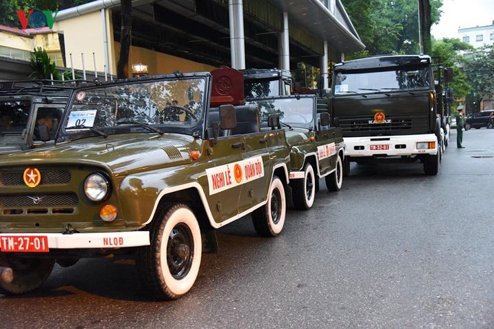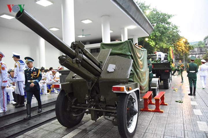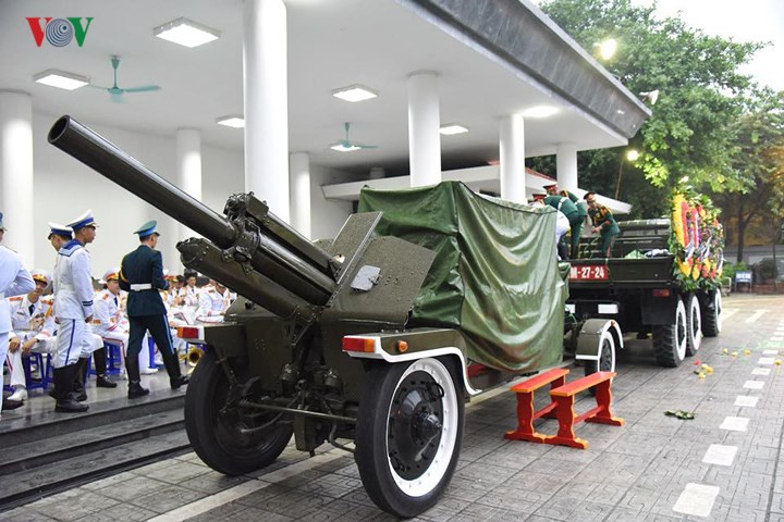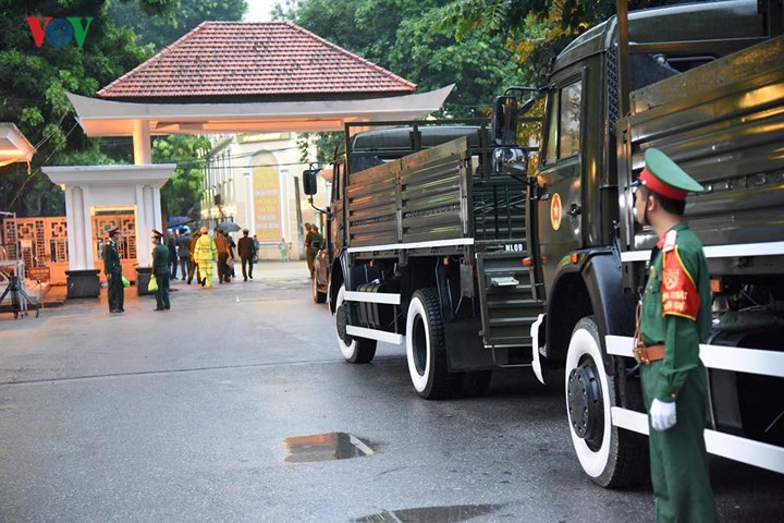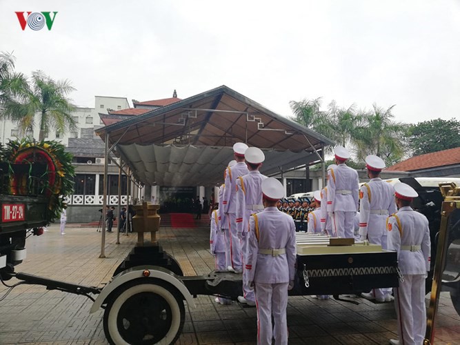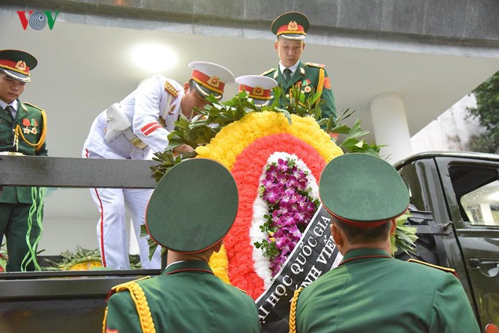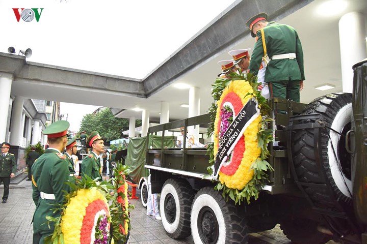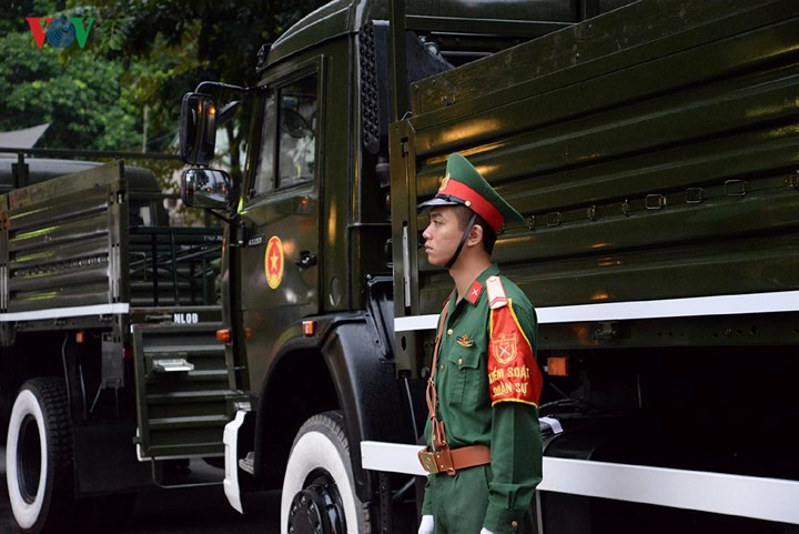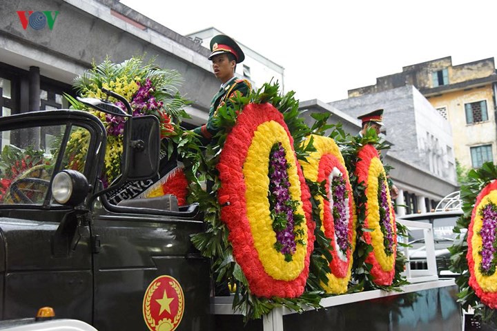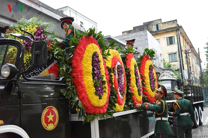 Đội nghi lễ đang gấp rút chuyển hoa lên đoàn xe tang lễ Chủ tịch nước Trần Đại Quang. Trong ảnh: Cỗ linh xa sẽ đưa linh cữu Chủ tịch nước Trần Đại Quang về nơi yên nghỉ cuối cùng tại quê hương ông - xã Quang Thiện, huyện Kim Sơn, tỉnh Ninh Bình.